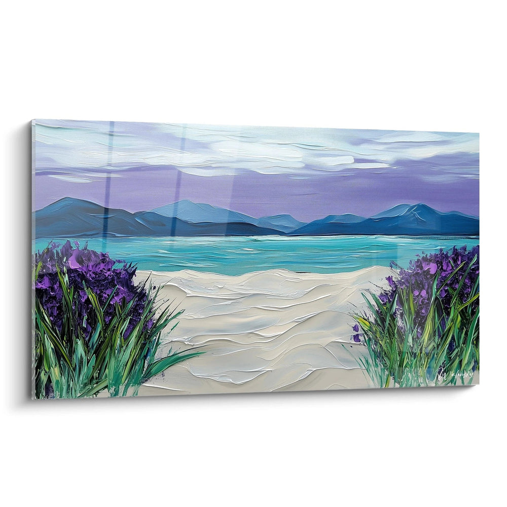 Ce tableau lavande offre une composition visuelle saisissante où un chemin de sable clair s'étend vers un horizon marin turquoise, bordé de massifs floraux violets abondants. L'œuvre présente une perspective centrale évidente qui guide immédiatement l'œil du spectateur vers les montagnes bleues à l'horizon. Le tableau lavande violet et turquoise crée une harmonie chromatique méditerranéenne distinctive avec ses touches vibrantes et son atmosphère sereine.