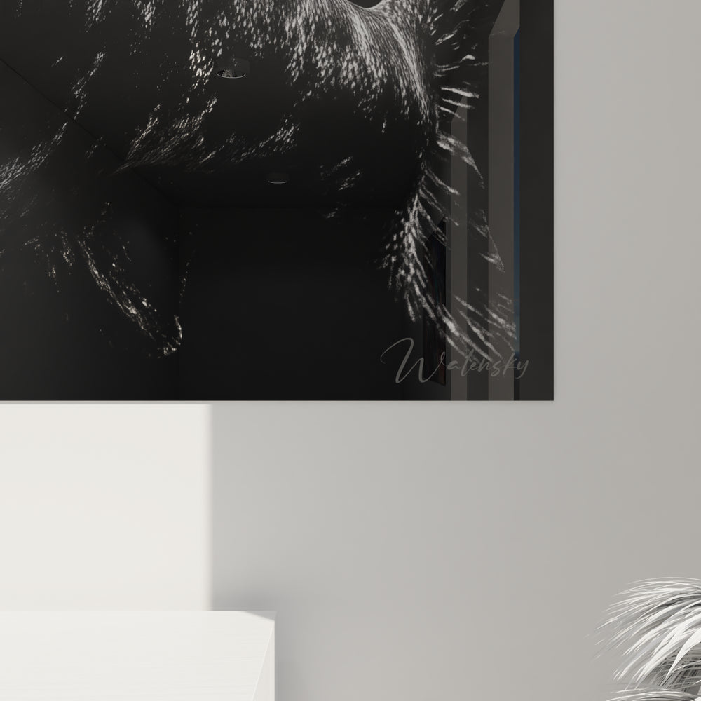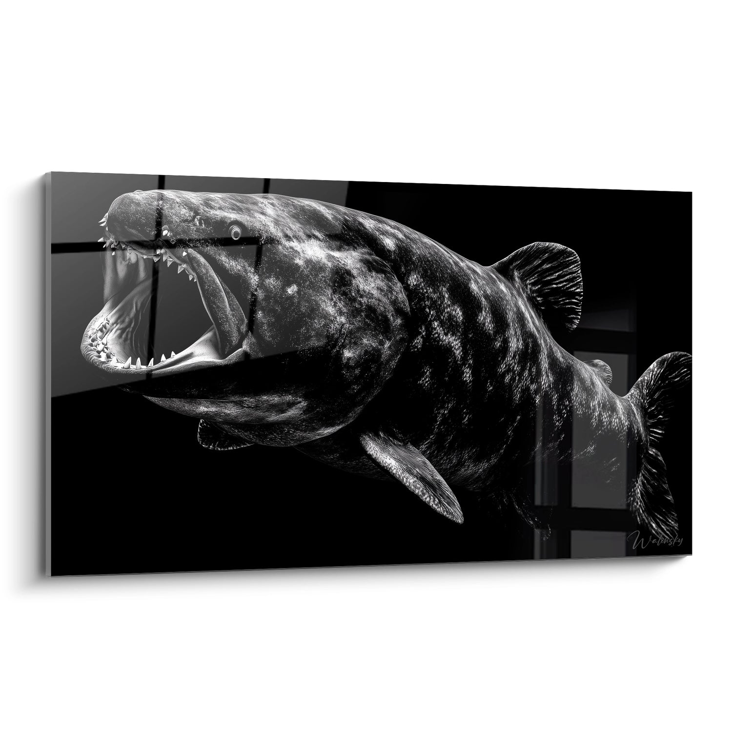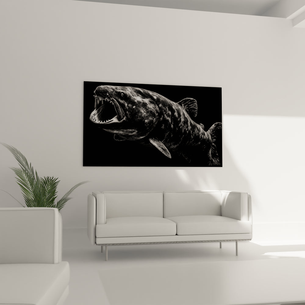 Ce tableau mural Dunkleosteus présente une représentation saisissante du plus redoutable prédateur préhistorique des océans dévoniens. L'œuvre capture avec une précision remarquable l'anatomie imposante de ce poisson cuirassé, dont la mâchoire béante révèle des plaques osseuses tranchantes comme des rasoirs. Le tableau Dunkleosteus noir et blanc met l'accent sur les détails anatomiques de cette créature marine légendaire, soulignant sa tête massive blindée et ses nageoires puissantes qui en faisaient le roi des mers il y a 380 millions d'années. Cette décoration murale paléontologique sublime transforme n'importe quel espace en véritable musée d'histoire naturelle. L'artiste a magistralement rendu la texture rugueuse de la carapace osseuse et l'expression féroce de ce monstre marin, créant une œuvre d'art préhistorique qui fascine autant qu'elle impressionne. Le contraste dramatique entre les zones d'ombre et de lumière confère à ce tableau moderne Dunkleosteus une profondeur exceptionnelle, faisant ressortir chaque détail de cette reconstitution scientifiquement fidèle. Cette représentation artistique du Dunkleosteus terrelli capture l'essence même de la puissance brute de ce super-prédateur, offrant aux amateurs de paléontologie et d'art contemporain une pièce décorative unique et éducative.