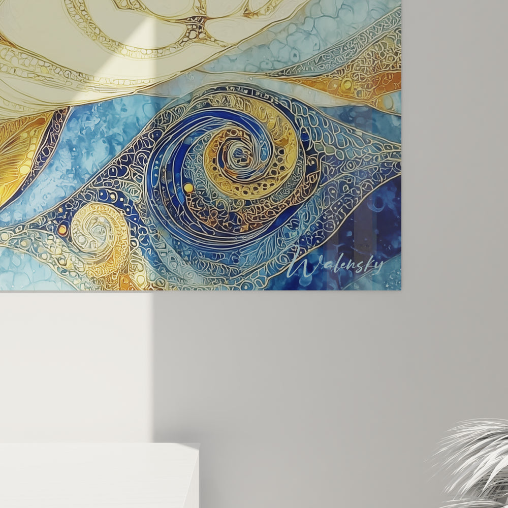 La palette chromatique bleu et or de ce tableau évoque la profondeur des océans anciens et la noblesse de ce super-prédateur. Les nuances de bleu cobalt et outremer symbolisent les abysses marines où évoluait le Dunkleosteus, tandis que les accents dorés ornementaux confèrent une dimension royale à cette créature légendaire. Cette harmonie colorielle transforme un prédateur redoutable en symbole de puissance maîtrisée et d'élégance naturelle.