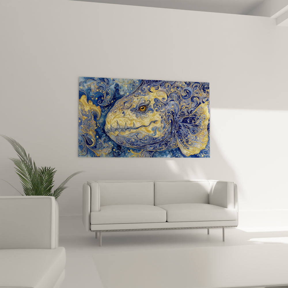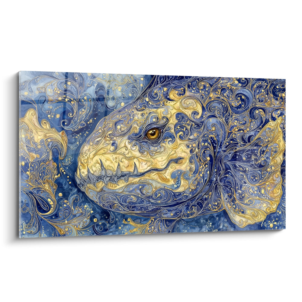 Ce tableau mural Dunkleosteus présente une interprétation artistique saisissante du redoutable prédateur préhistorique. L'œuvre transforme ce poisson cuirassé du Dévonien en une créature mystique aux allures baroques, ornée de volutes dorées et de motifs floraux complexes. Le Dunkleosteus terrelli apparaît ici dans un style décoratif rappelant les manuscrits enluminés, où chaque écaille devient un élément ornemental raffiné. Les mâchoires puissantes du Dunkleosteus conservent leur caractère imposant tout en étant sublimées par des arabesques dorées qui s'entremêlent harmonieusement. Cette représentation artistique paléontologique marie parfaitement science et art décoratif, créant un tableau dinosaure marin d'exception. L'artiste a magistralement capturé l'essence de ce prédateur des océans primitifs tout en lui conférant une dimension esthétique contemporaine. Les détails anatomiques restent fidèles aux découvertes paléontologiques, notamment la structure caractéristique de la tête osseuse. Cette œuvre d'art préhistorique s'inscrit dans une démarche de vulgarisation scientifique par l'art, rendant accessible la magnificence de la faune du Paléozoïque. Le style ornemental choisi évoque les bestiaires médiévaux, conférant au Dunkleosteus une aura légendaire digne des créatures mythologiques.