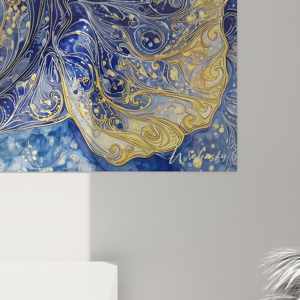 La palette chromatique de ce tableau mural Dunkleosteus s'articule autour des bleus profonds océaniques et des dorures éclatantes, symbolisant la rencontre entre les mystères abyssaux et la préciosité de l'art. Les tons bleus évoquent les océans du Dévonien où régnait ce super-prédateur, tandis que l'or apporte une dimension sacrée à cette créature fossile. Cette harmonie coloriste transforme le Dunkleosteus placodermata en emblème de puissance et de beauté éternelle.