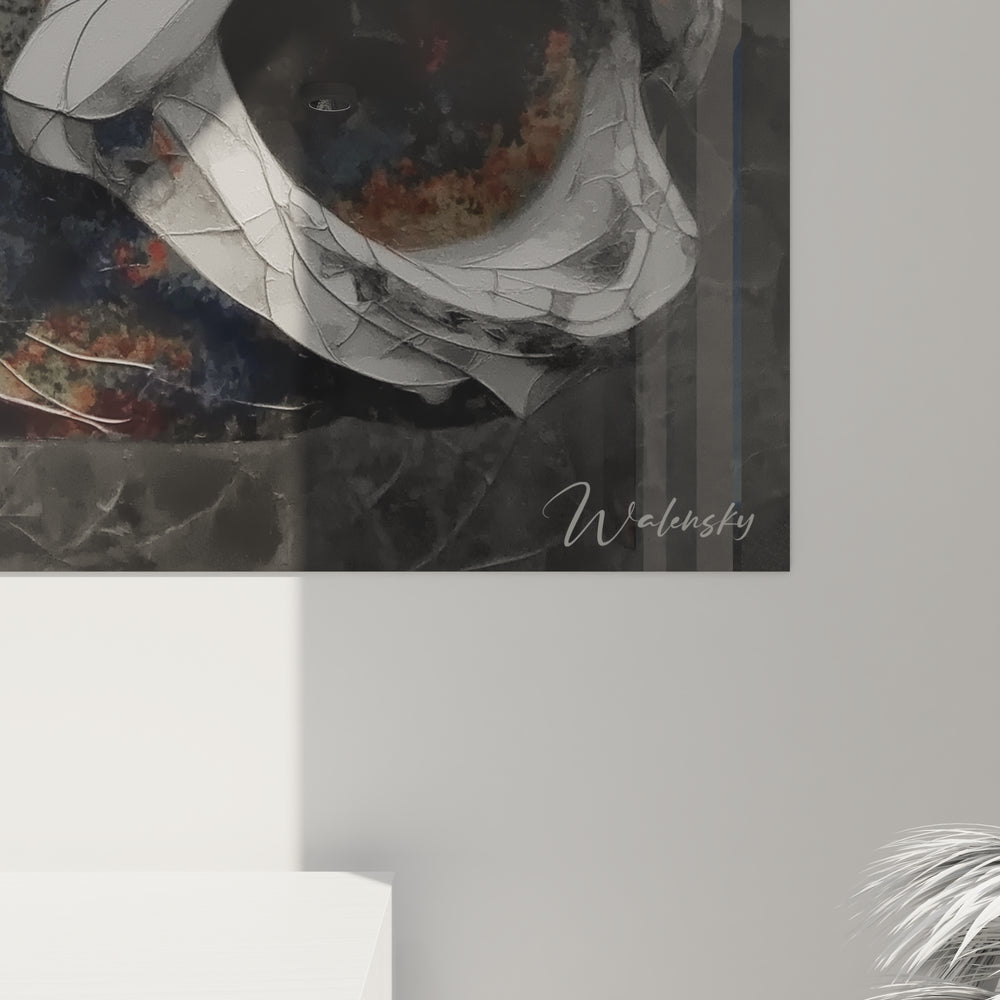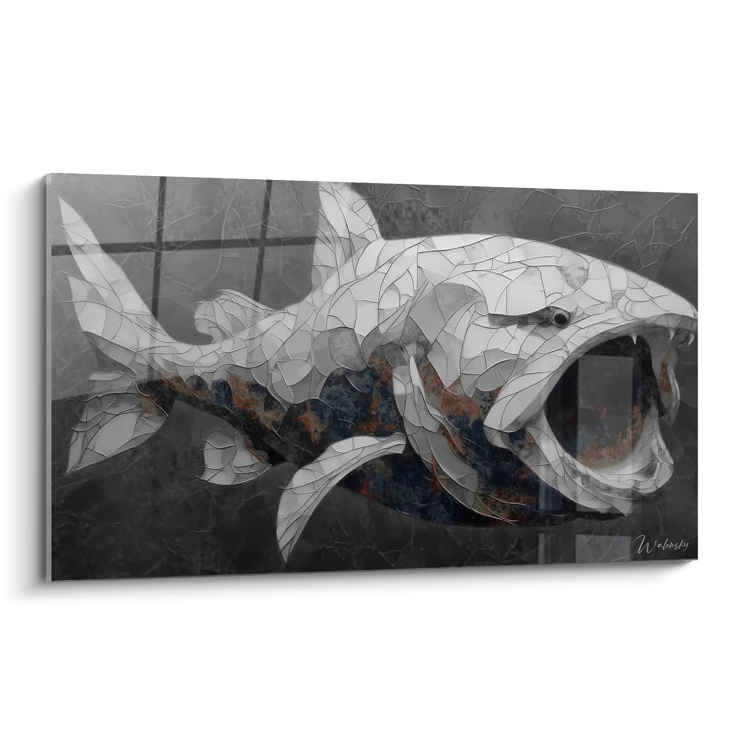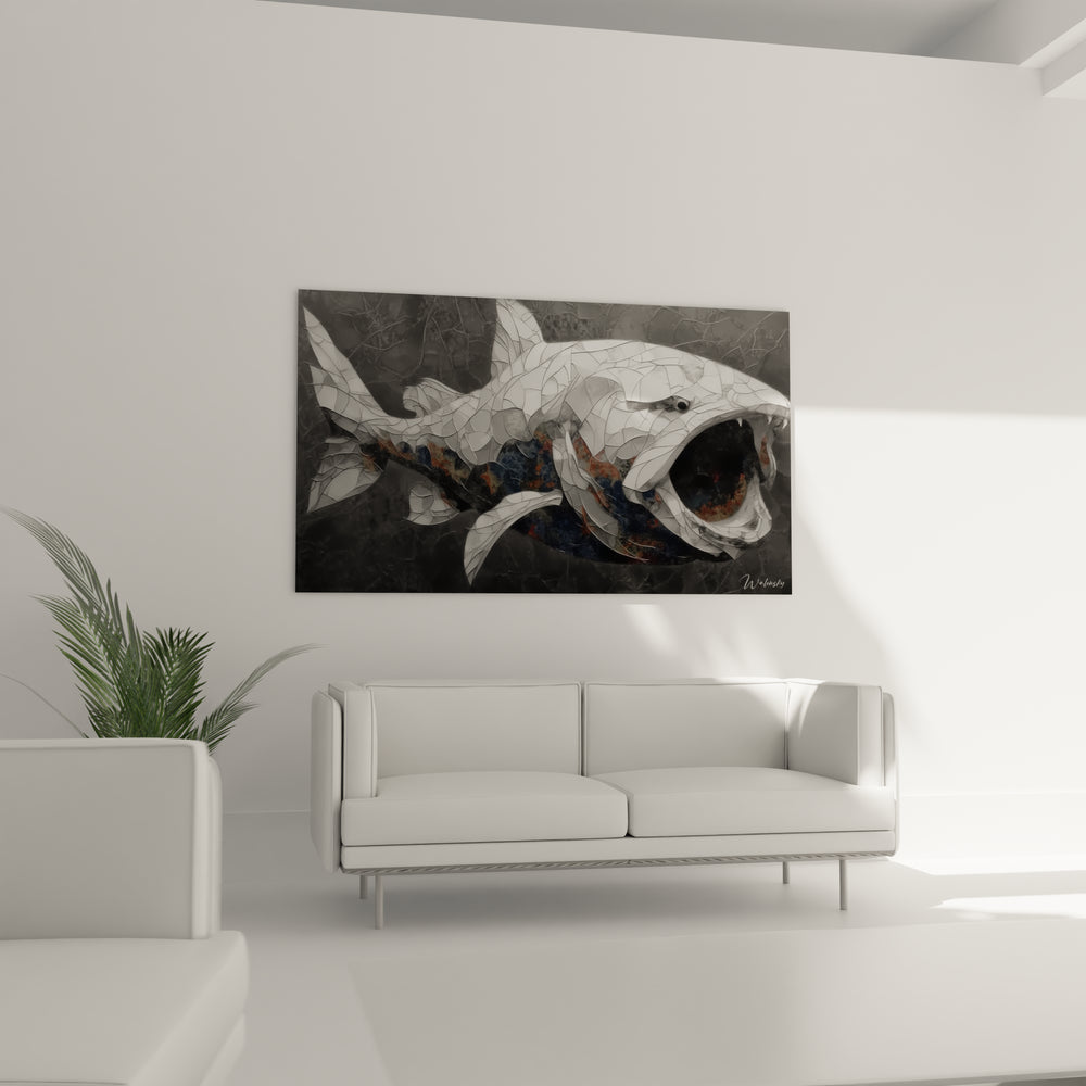 La palette chromatique de ce tableau Dunkleosteus artistique évoque les profondeurs marines ancestrales à travers des tons de gris sophistiqués et des nuances métalliques. Ces couleurs symbolisent la puissance brute et l'aspect cuirassé de cette créature légendaire, tandis que les jeux d'ombre et de lumière créent une atmosphère mystérieuse rappelant les abysses préhistoriques où régnait ce titan des mers.