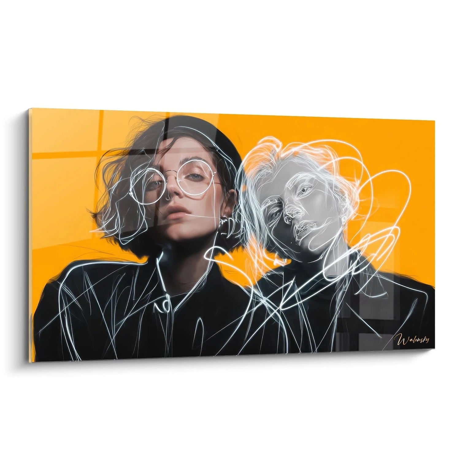 Ce tableau mural portrait exceptionnel présente un portrait féminin d'une rare intensité artistique, où se mélangent harmonieusement photographie et illustration graphique. L'œuvre met en scène une jeune femme aux traits délicats, coiffée d'une chevelure brune ondulante et portant des lunettes rondes qui accentuent son regard perçant. Accompagnée d'un chien aux contours finement esquissés, elle incarne l'élégance moderne dans un style vestimentaire sobre et raffiné, vêtue d'une veste noire qui contraste magnifiquement avec l'arrière-plan orange vibrant. La technique artistique employée révèle une maîtrise exceptionnelle du mélange des genres : le réalisme photographique se fond avec des lignes blanches ondulantes qui créent un mouvement poétique autour des figures principales. Ces courbes fluides apportent une dimension onirique à l'ensemble, transformant un simple portrait en une œuvre d'art contemporaine captivante. La signature Walusky témoigne de l'authenticité de cette création unique qui s'inscrit parfaitement dans l'univers de l'art mural moderne. Cette pièce murale s'impose comme un véritable statement artistique, capable de transformer n'importe quel espace intérieur en galerie d'art contemporain. Ce tableau décoratif orange offre une décoration murale tendance incomparable.