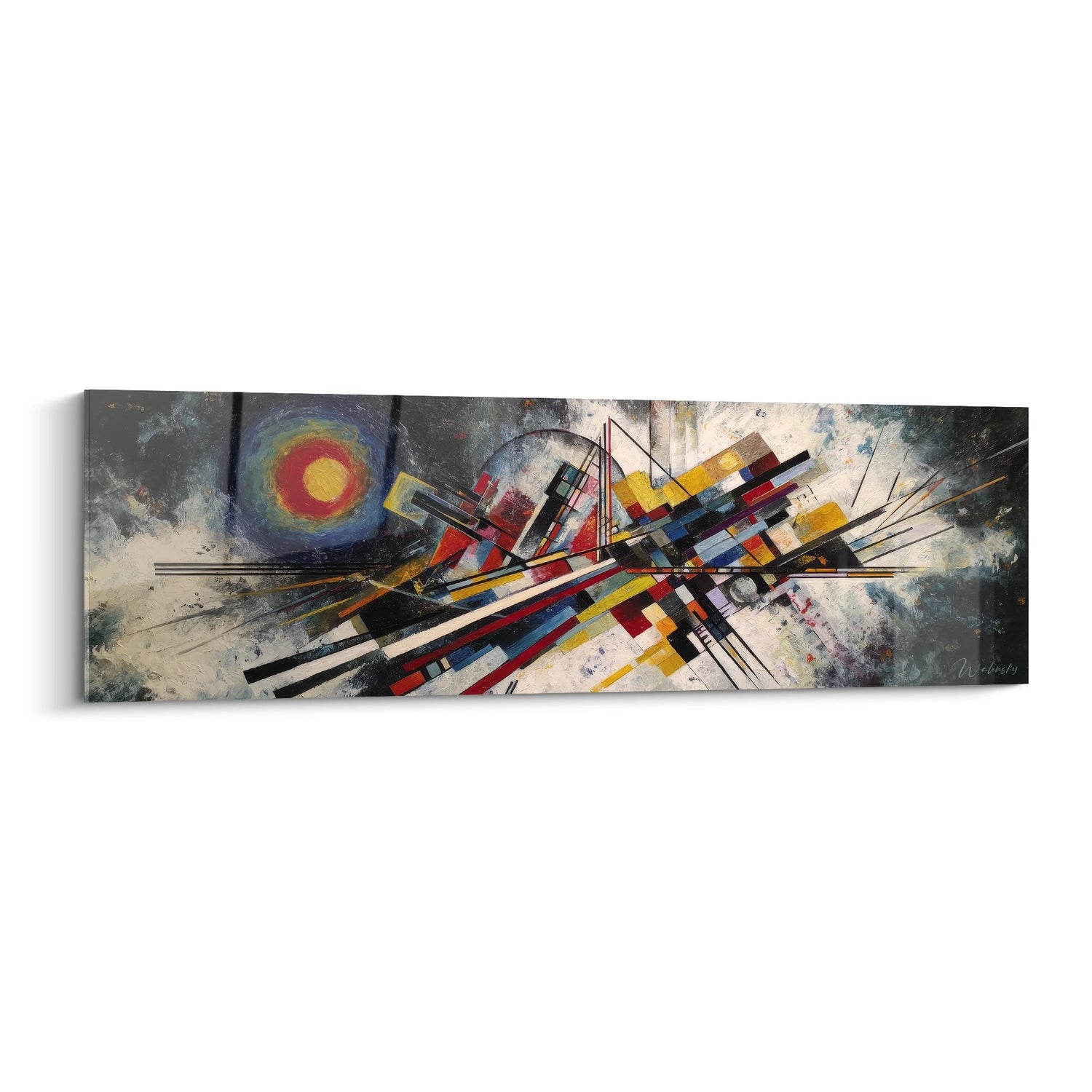 Ce tableau mural géométrique abstrait présente une composition explosive et dynamique qui capture l'essence du mouvement dans l'art moderne. Au centre de l'œuvre, un enchevêtrement complexe de formes géométriques colorées - rectangles, lignes et angles - se croisent et s'entrecroisent dans une danse visuelle captivante. Les éléments abstraits contemporains s'étendent à travers la toile avec une énergie palpable, créant un point focal puissant qui attire immédiatement l'œil. Dans le coin supérieur gauche, un cercle concentrique aux teintes rouge, jaune et bleue rappelle un soleil stylisé ou une cible cosmique, ajoutant une dimension mystérieuse à cette composition géométrique moderne. Les lignes noires dynamiques traversent l'ensemble de la toile comme des rayons d'énergie, unifiant les différents éléments colorés dans une harmonie visuelle remarquable. Cette œuvre d'art géométrique abstraite transforme instantanément n'importe quel espace en galerie d'art contemporain, apportant sophistication et caractère à votre décoration murale moderne.