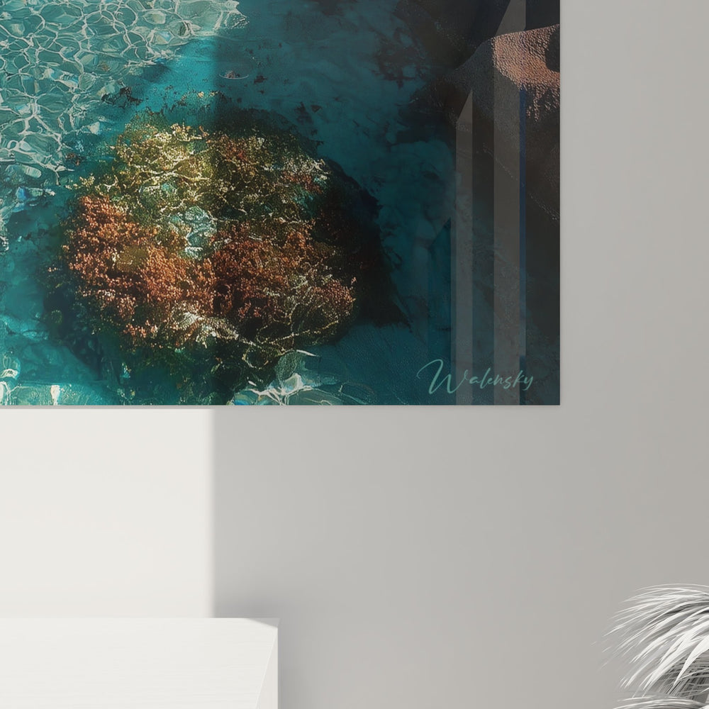 Ce tableau mural eaux cristallines capture la beauté saisissante des fonds marins méditerranéens avec une précision photographique remarquable. L'œuvre révèle un univers aquatique d'une transparence exceptionnelle, où les formations rocheuses émergent comme des sculptures naturelles dans les profondeurs turquoise. Les rochers sous-marins se parent de teintes ocre et rougeâtres, créant un contraste saisissant avec la clarté cristalline de l'eau. Cette décoration murale marine transforme instantanément votre intérieur en fenêtre ouverte sur les merveilles des fonds marins méditerranéens. Les jeux de lumière filtrant à travers l'eau créent des motifs hypnotiques à la surface, évoquant la danse perpétuelle des rayons solaires dans les profondeurs. Chaque détail de ce tableau photographique aquatique révèle la richesse des écosystèmes marins, des algues colorées aux textures minérales des roches sculptées par les courants. L'artiste Walensky a su capturer cette ambiance marine apaisante qui évoque instantanément les vacances en bord de mer et la sérénité des eaux méditerranéennes. Cette œuvre s'intègre parfaitement dans une décoration contemporaine, apportant une touche de fraîcheur et d'évasion à votre salon, chambre ou bureau.