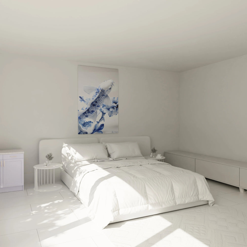 Ce tableau célèbre la beauté intemporelle du poisson koï, symbole de persévérance et de chance dans de nombreuses cultures asiatiques. Sa silhouette élégante et fluide, finement dessinée dans le bleu cobalt profond et le blanc immaculé de la porcelaine, semble glisser avec légèreté sur la surface, évoquant la tranquillité d’un bassin paisible au cœur de votre intérieur.