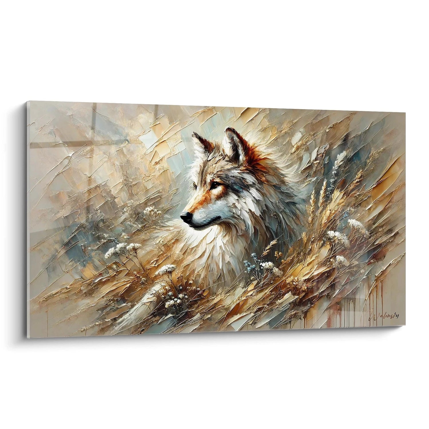 Ce tableau est bien plus qu’une simple représentation : c’est une ode à l’harmonie subtile entre la faune et la flore, où le loup, symbole de force et de sagesse, se révèle dans toute sa noblesse. La scène respire la sérénité, un appel à la contemplation qui apaise l’esprit et invite au calme. Chaque détail — des coups de pinceau expressifs aux nuances chaleureuses de bronze, beige et blanc — contribue à créer une atmosphère enveloppante, presque tactile, où vous pouvez presque sentir la brise effleurer la végétation.