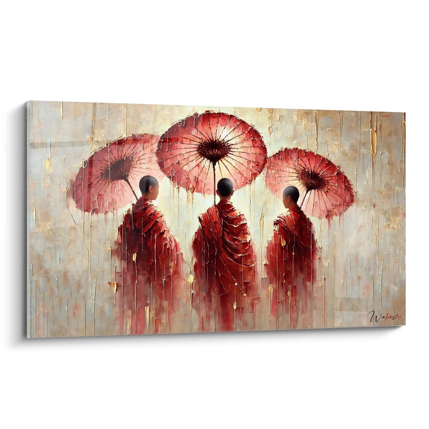 Immergez-vous dans une atmosphère où calme et harmonie fusionnent avec élégance grâce au Tableau Échos Spirituels - Édition Divers Zen. Cette œuvre sophistiquée invite à une pause profonde, un instant suspendu loin du tumulte du quotidien. En observant ses trois personnages vêtus de rouge, abrités sous de vastes parapluies, vous ressentez immédiatement la douce vibration d’une communion silencieuse, un souffle de tranquillité incarné au cœur de votre espace de vie.