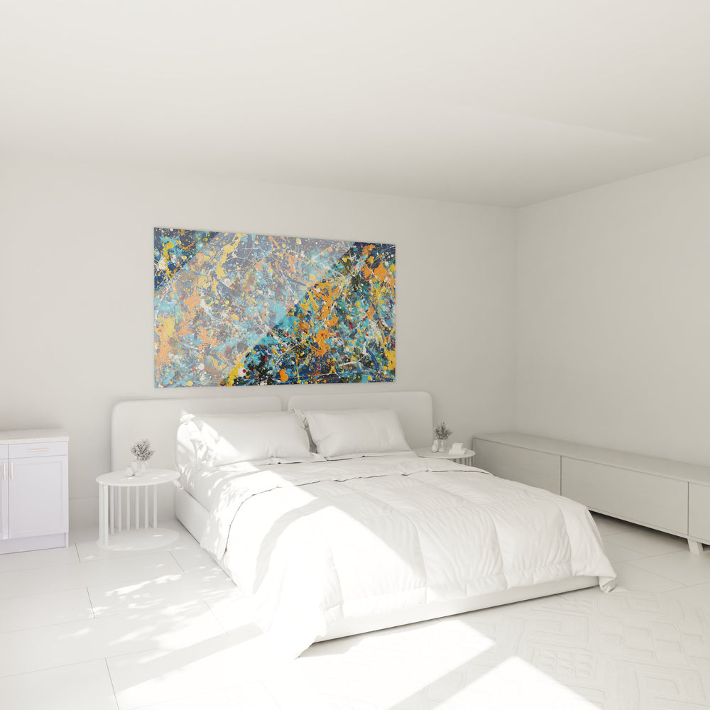 Ce tableau mural éclaboussures colorées présente une composition dynamique d'une intensité saisissante, caractéristique du style peinture abstrait contemporain. L'œuvre révèle un chaos organisé d'éclaboussures de peinture qui semblent avoir été projetées avec une énergie débordante sur la toile. Les projections de couleurs vives créent un réseau complexe de formes organiques et de lignes directionnelles qui guident le regard à travers l'ensemble de la composition. Cette peinture abstraite moderne évoque le mouvement du dripping et de l'action painting, techniques emblématiques de l'art abstrait du XXe siècle. Les couleurs se superposent, se mélangent et s'entrechoquent dans une danse visuelle captivante, créant des zones de densité variable qui donnent du rythme à l'œuvre. Ce tableau décoratif abstrait transforme l'espace en galerie d'art contemporain, apportant une dimension artistique sophistiquée à votre intérieur. L'aspect texturé et la richesse chromatique de cette œuvre d'art murale contemporaine en font un point focal idéal pour sublimer votre décoration.