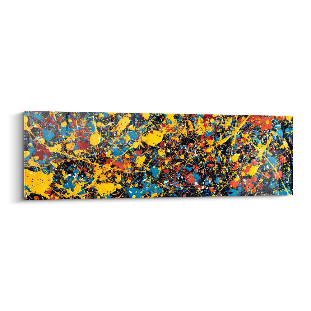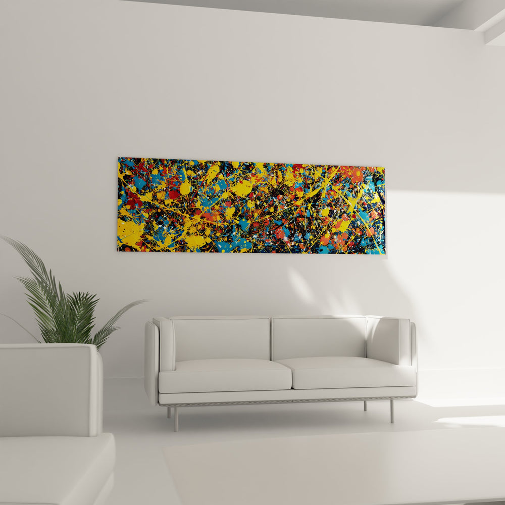 Ce tableau mural éclaboussures multicolores présente une composition dynamique inspirée de la technique du dripping, rappelant les œuvres de l'art abstrait contemporain. L'œuvre se caractérise par une explosion de couleurs vives où dominent le jaune éclatant, le bleu azur, le rouge vermillon et l'orange vibrant, créant un ensemble harmonieux malgré l'apparente spontanéité. Les projections de peinture abstraite s'entremêlent dans un ballet coloré, formant des lignes gestuelles et des taches organiques qui donnent vie à la toile. Cette peinture abstraite gestuelle moderne révèle une technique maîtrisée où chaque éclaboussure semble calculée pour créer un équilibre visuel parfait. Les couleurs primaires et secondaires se mélangent par endroits, créant des nuances subtiles qui enrichissent la palette chromatique. Ce tableau décoratif contemporain coloré présente une texture visuelle riche, où les superpositions de couleurs créent des effets de profondeur et de mouvement. L'art mural abstrait expressif révèle ici toute sa puissance émotionnelle, invitant le spectateur à une lecture personnelle de ces formes libres et spontanées.