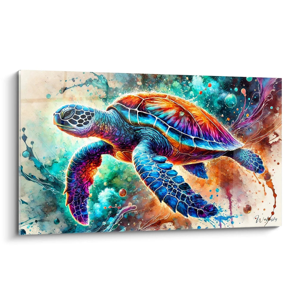 Ce tableau vous transporte instantanément dans un monde où la nature se révèle dans toute sa splendeur. Chaque nuance, des tons profonds de bleu aux éclats chauds d’orange, crée une harmonie visuelle qui stimule les sens tout en apaisant l’esprit. L’effet de couches successives et la texture dynamique évoquent les courants marins et la grâce silencieuse de la tortue, symbole de sagesse et de longévité. L’énergie vibrante de cette œuvre apporte une aura positive et légère à votre intérieur, invitant à la rêverie et à l’émerveillement.