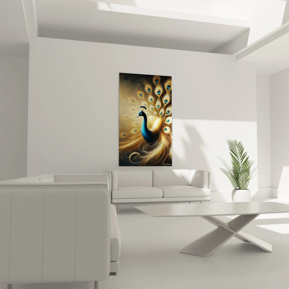 Au cœur de cette œuvre, le paon se dévoile dans toute sa splendeur, baigné dans une lumière qui évoque douceur et majesté. Son plumage riche en nuances bleues profondes, survolées par un éclat doré subtil, donne vie à une scène à la fois réaliste et onirique. Ce tableau vous invite à plonger dans un univers où chaque détail, chaque reflet, suscite émotion et contemplation.