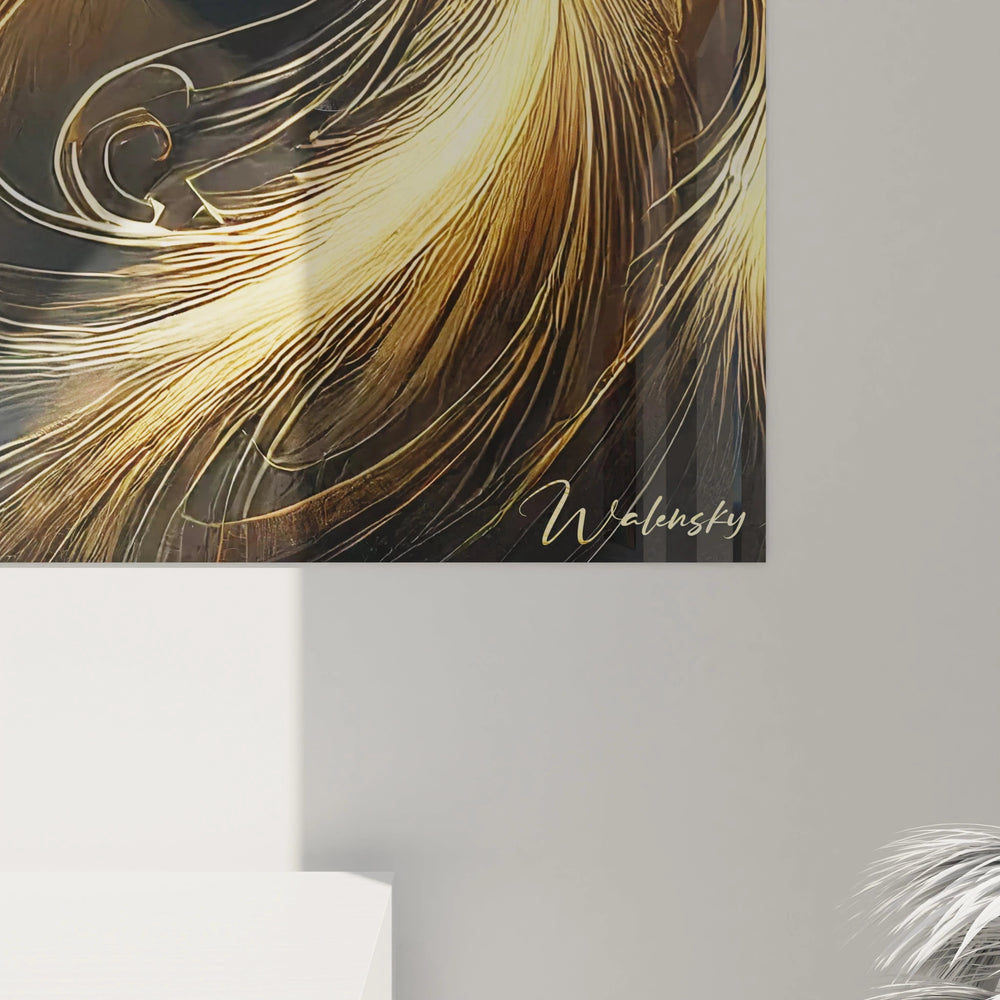 La palette raffinée, mêlant bleu, or et beige, crée une harmonie visuelle apaisante. Chaque plume semble vibrer d’une énergie tranquille, offrant à votre espace une aura chaleureuse et luxueuse. Ce contraste délicat entre la profondeur du bleu et la brillance dorée capte la lumière ambiante, illuminant votre pièce à tout moment de la journée.