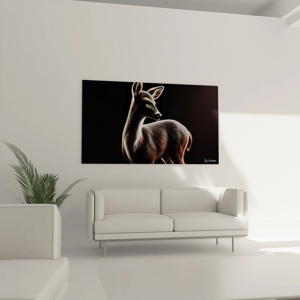 Ce tableau vous invite à plonger dans une atmosphère magique, créée par le jeu puissant du clair-obscur. Le fond noir profond fait ressortir avec éclat le pelage aux nuances naturelles de marron et de blanc, tandis que chaque détail de la biche est souligné avec une précision presque photographique. Vous percevez presque la douceur de son pelage sous vos doigts, la finesse de son regard hypnotique qui semble vous inviter à un dialogue silencieux avec la forêt.