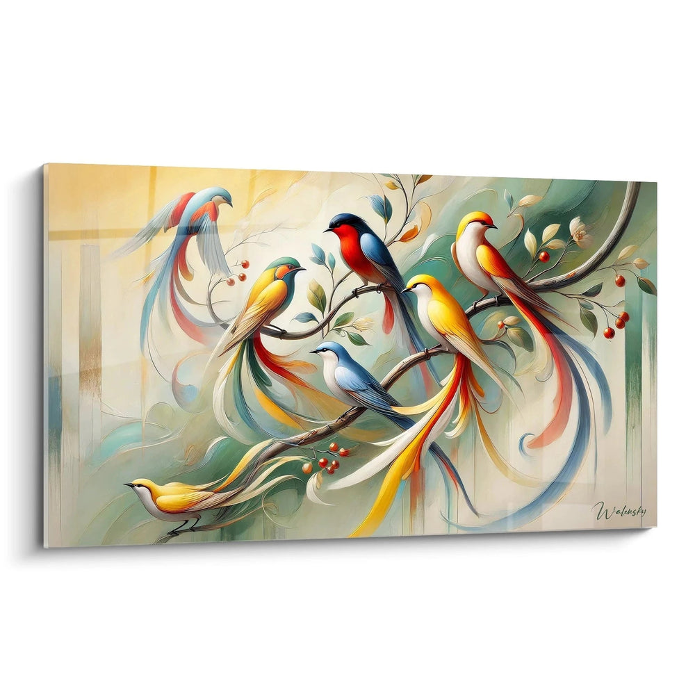 Imaginez un instant où le temps ralentit, où la lumière caresse doucement les plumages chatoyants. Ce tableau vous plonge au cœur de cette scène magique, où chaque oiseau se dévoile avec une grâce aérienne. Plus qu’une simple décoration, il incarne l’équilibre parfait entre diversité et unité, illustrant la beauté singulière de chaque créature tout en célébrant leur coexistence paisible.