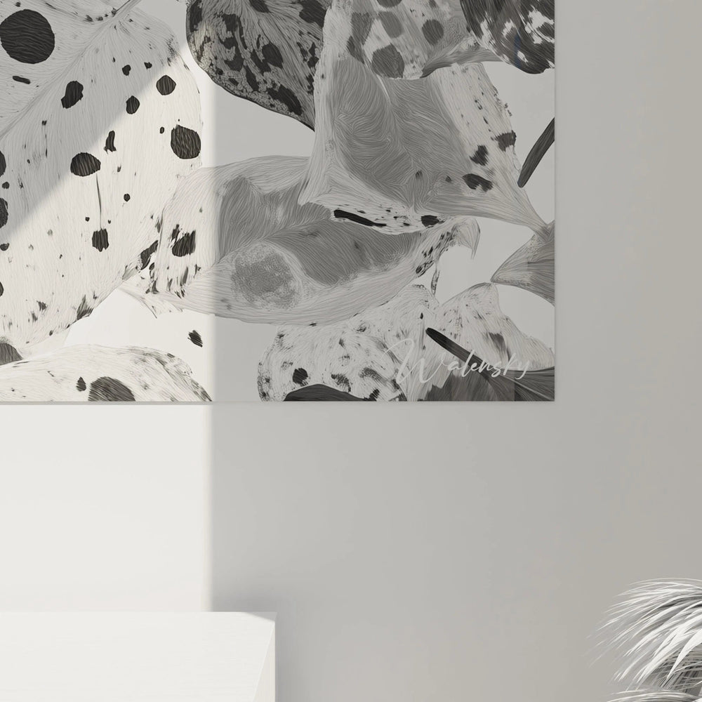 Ce tableau botanique se distingue par son approche artistique moderne où les éléments végétaux se mêlent harmonieusement aux projections tachetées. L'œuvre présente une composition florale stylisée en nuances de gris, créant un tableau végétal contemporain d'une élégance remarquable. Les feuilles aux formes organiques se détachent sur un fond parsemé de taches circulaires de différentes tailles, évoquant les gouttes de rosée matinales. Cette décoration murale botanique capture immédiatement l'attention par son équilibre parfait entre chaos contrôlé et harmonie naturelle, où chaque élément végétal semble danser dans un ballet monochrome sophistiqué.