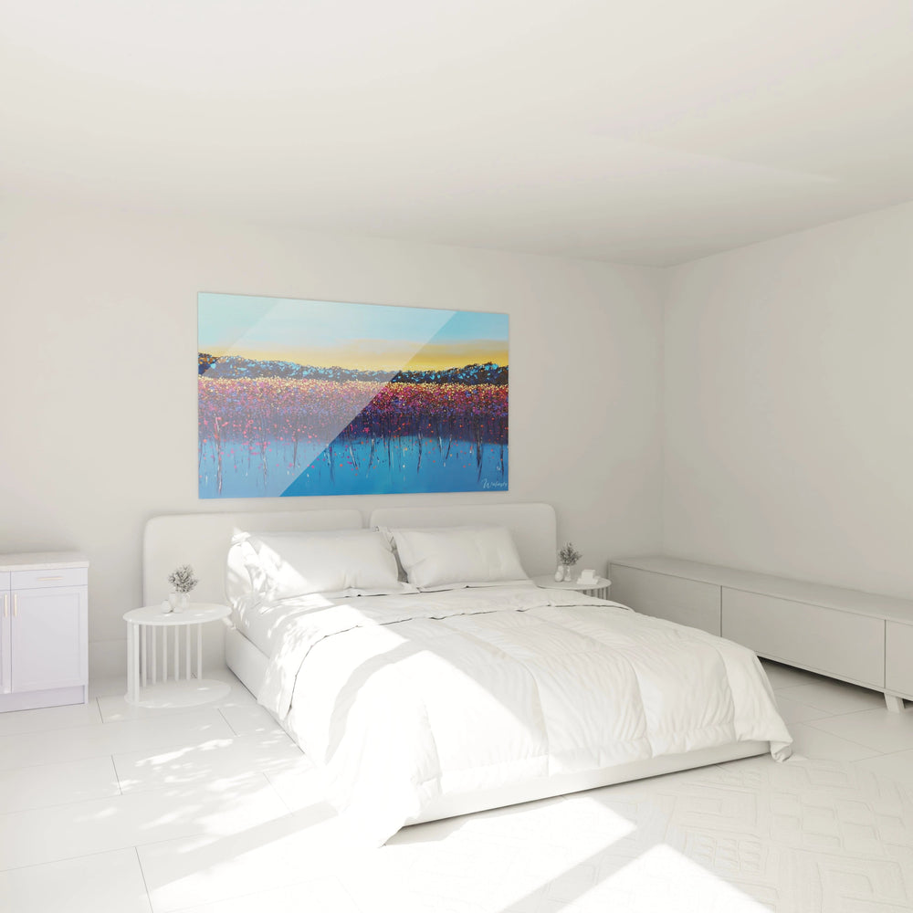 Plongez dans l'univers captivant de ce tableau florissant où l'horizon se dévoile en une symphonie chromatique saisissante. Au premier regard, on est immédiatement frappé par le contraste entre le bleu profond et les touches vibrantes de rose et d'orange qui semblent danser à la surface. Ce tableau florissant se distingue par sa composition horizontale qui divise l'espace en trois zones distinctes: un ciel doré, une bande centrale colorée et une base azurée. L'effet visuel créé par la multitude de points lumineux évoque un champ de fleurs sauvages se reflétant dans l'eau d'un lac paisible au crépuscule.