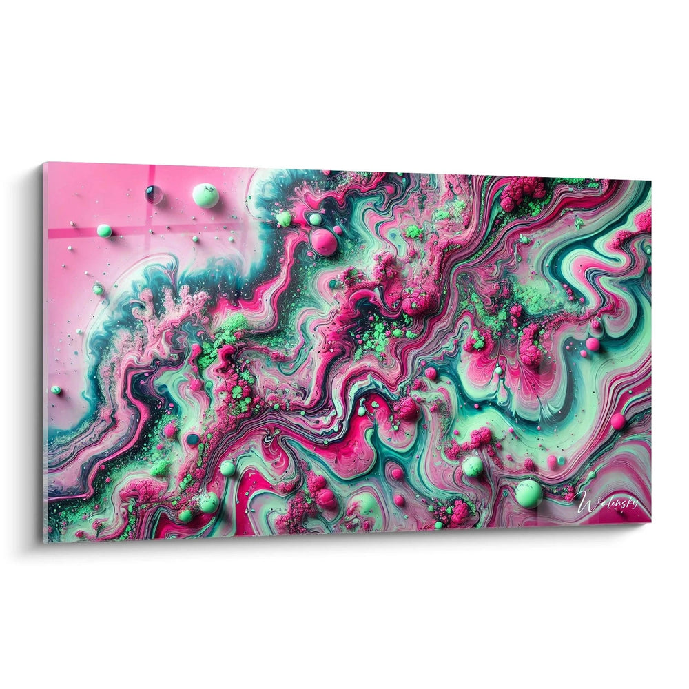Ce tableau sait parler au cœur de ceux qui souhaitent insuffler dynamisme et audace à leur intérieur. Les roses éclatants s’entrelacent avec des touches de vert frais, tandis que le noir profond apporte une structure élégante et mystérieuse. Grâce à la technique epoxy, la surface lumineuse et lisse révèle des profondeurs surprenantes, évoquant des mondes où la lumière danse au rythme de vos émotions.