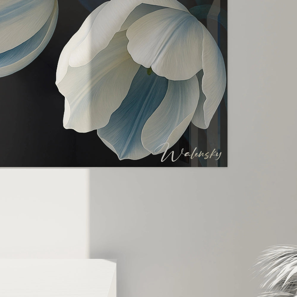 Laissez-vous transporter au cœur d’un jardin suspendu dans le temps avec le Tableau Éclosion Pure - Édition Fleur Nature. Ce chef-d’œuvre artistique sublime la délicatesse des tulipes blanches, telles des joyaux immaculés éclairés par un feuillage bleu profond et mystérieux. Imaginez un instant ces fleurs écloses après une pluie fine, leurs pétales translucides et satinés captant la lumière d’une manière presque magique, comme si la nature elle-même avait offert son plus précieux cadeau à votre intérieur.