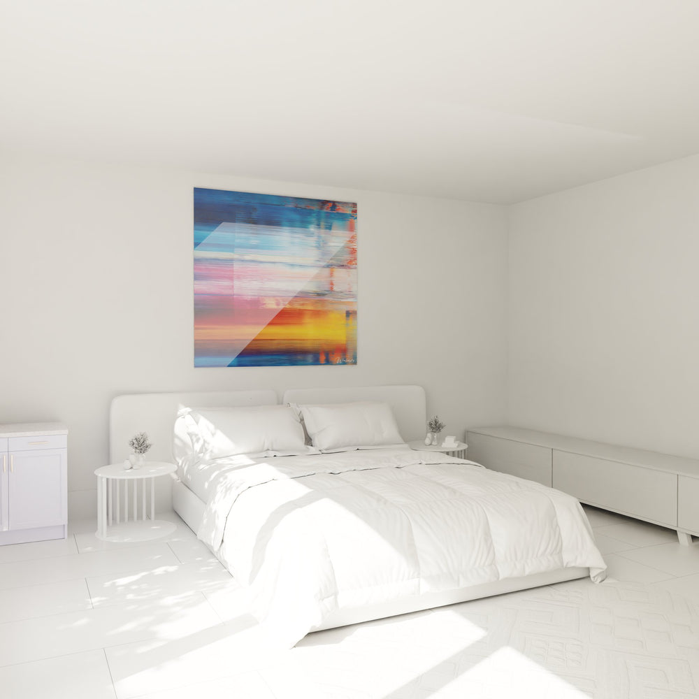 Cette peinture abstraite contemporaine s'inscrit dans la lignée des artistes explorant les dysfonctionnements technologiques comme Takeshi Murata ou Rosa Menkman. Elle évoque également les recherches chromatiques de Gerhard Richter dans ses œuvres raclées, tout en y apportant une dimension résolument moderne. Ce tableau mural décoratif dialogue avec l'art glitch et l'esthétique de l'erreur numérique transformée en beauté.