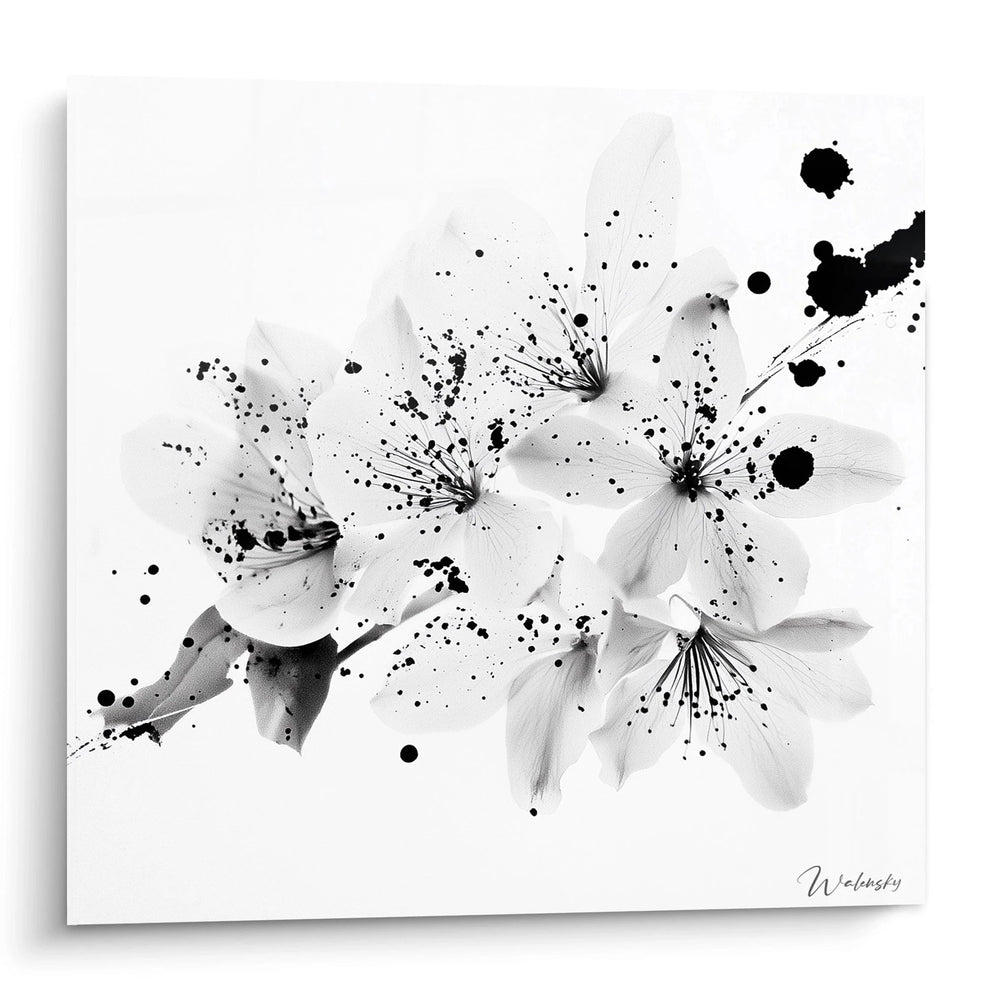 La palette chromatique de ce tableau fleurs se limite délibérément au noir et blanc, créant une harmonie monochrome d'une grande puissance expressive. Le blanc dominant des fleurs n'est pas uniforme mais présente de subtiles variations de luminosité et de texture qui enrichissent la composition. Le noir profond des éclaboussures varie en intensité et en transparence, créant des nuances qui vont du gris fumé au noir le plus intense.