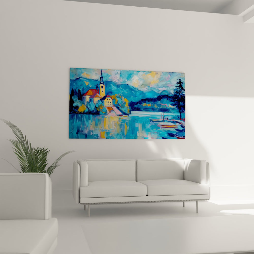 Tags : tableau lac alpin, paysage montagne église, art impressionniste, décoration murale lac, peinture reflets eau