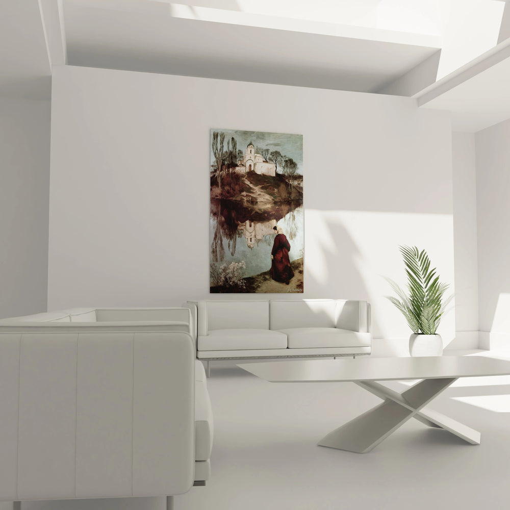 Ce tableau église orthodoxe présente une composition d'une beauté saisissante, dominée par une architecture religieuse byzantine majestueuse qui se dresse sur une colline verdoyante. L'œuvre révèle immédiatement son caractère contemplatif à travers la présence d'une figure humaine en habits bordeaux, positionnée stratégiquement au premier plan. Cette décoration murale église contemplative offre une perspective unique où l'édifice religieux blanc aux coupoles caractéristiques se reflète parfaitement dans les eaux calmes d'un lac. L'ensemble crée une atmosphère de recueillement profond, renforcée par la végétation luxuriante qui encadre naturellement la scène. Les tons terreux et les nuances douces confèrent à ce tableau église reflet lacustre une dimension spirituelle immédiatement perceptible.