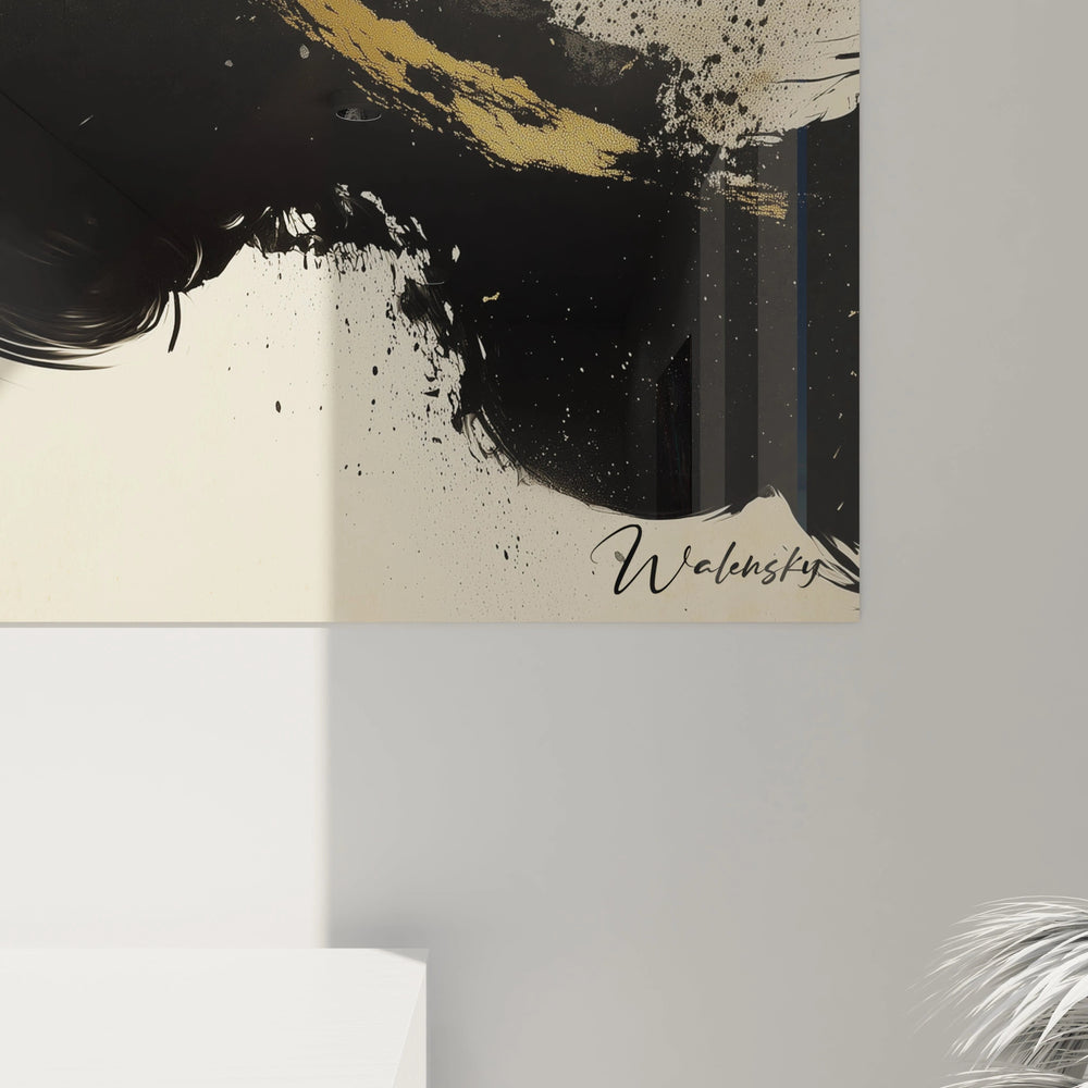 Ce tableau abstrait noir captive immédiatement par ses mouvements fluides et sa composition dynamique sur fond beige chaleureux. L'œuvre présente des coulées noires puissantes qui traversent la surface dans un élan spontané, créant un dialogue visuel saisissant avec les touches dorées qui ponctuent l'ensemble. Cette décoration murale abstraite révèle une gestuelle libre et expressive, où chaque trait semble porter l'émotion brute de l'artiste. Les éclaboussures et projections donnent une dimension tactile à l'œuvre, invitant l'œil à suivre le parcours sinueux des formes organiques qui se déploient avec une élégance naturelle.