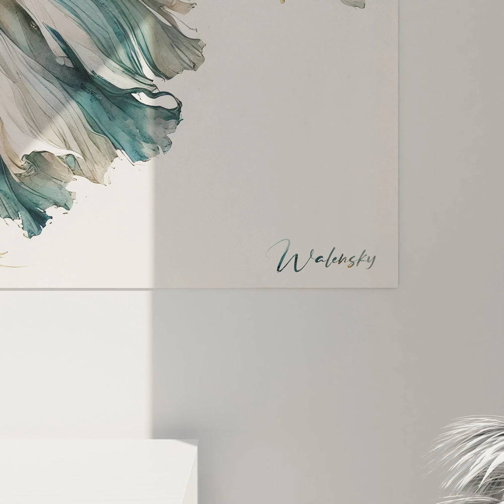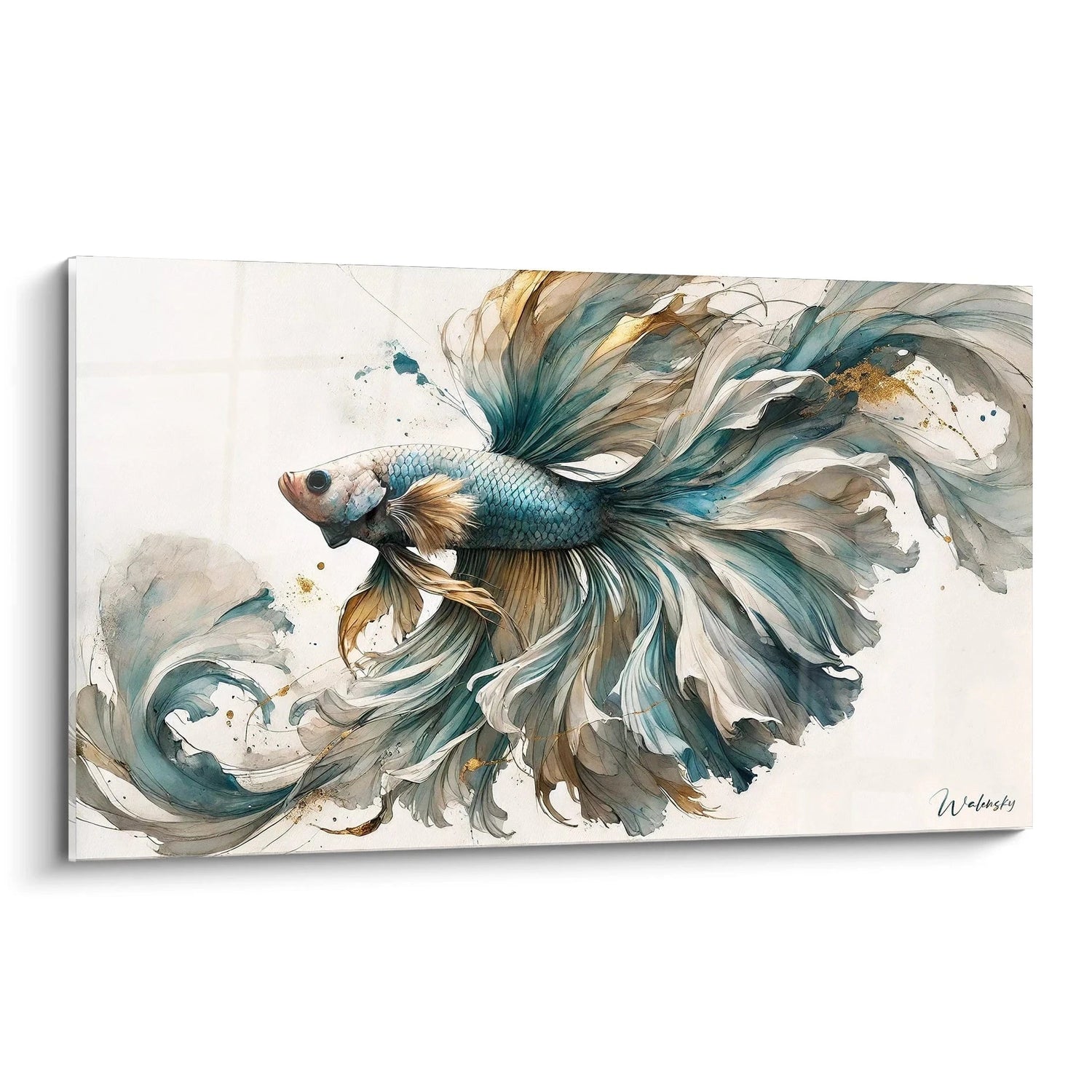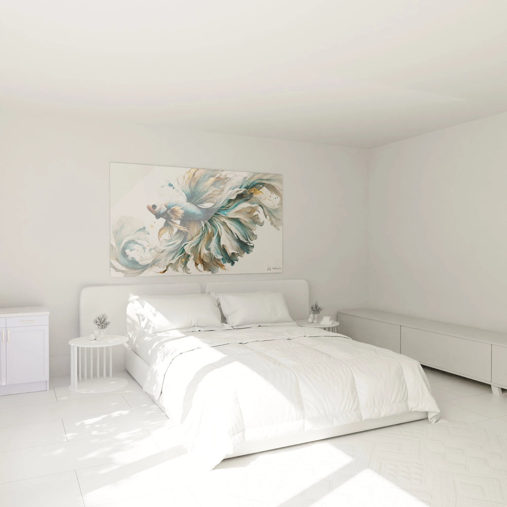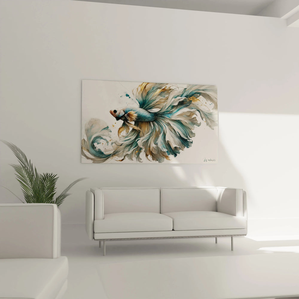 Ce tableau vous invite à plonger dans un univers où le mouvement devient poésie. Le betta, avec ses courbes harmonieuses et ses nuances subtiles de bleu, beige et or, donne vie à une ambiance à la fois apaisante et captivante. En l’intégrant à votre décoration, vous insufflez à votre intérieur une sensation de légèreté et de calme, idéale pour créer un espace où chaque moment devient un instant suspendu, loin du tumulte quotidien.