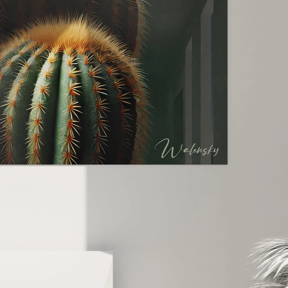Chaque détail de ce tableau vous invite à plonger dans l’univers fascinant de la nature sauvage. Les épines orangées, lumineuses comme un éclat de soleil au cœur de l’aridité, contrastent superbement avec les verts profonds de la plante. Le fond sombre enveloppe le tout d’une aura mystérieuse, mettant en lumière l’équilibre parfait entre robustesse et délicatesse. Lorsque vous contemplez cette création, vous ressentez une invitation à la méditation, une pause apaisante dans le tumulte du quotidien.