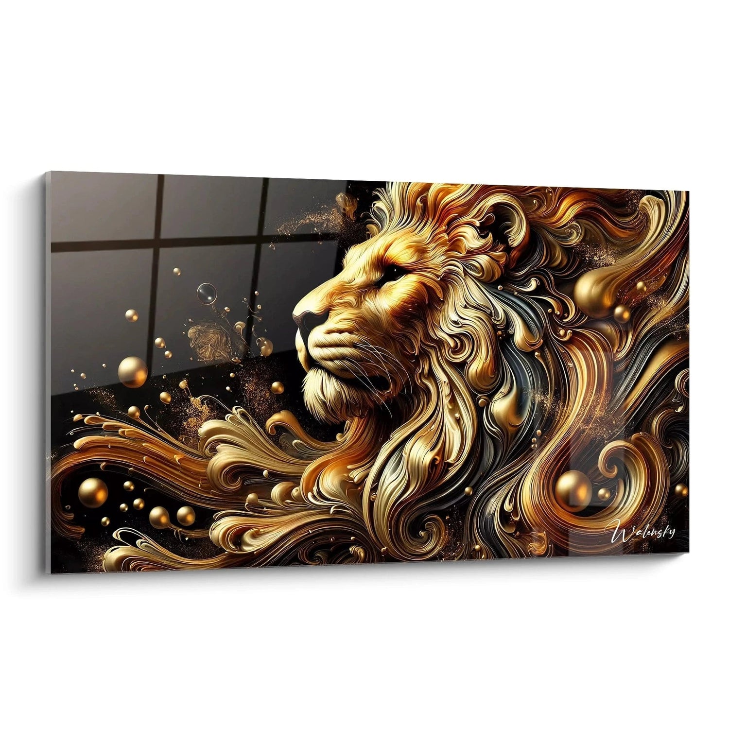 Imaginez-vous face à ce magnifique lion, dont les yeux perçants vous fixent avec une détermination calme. La crinière tourbillonnante, baignée de nuances d’or et de bronze, semble onduler au rythme d’un vent chaud qui traverse la plaine africaine. Chaque courbe fluide de ce tableau évoque la force vibrante de la nature, enveloppant votre espace d’une atmosphère à la fois puissante et apaisante.