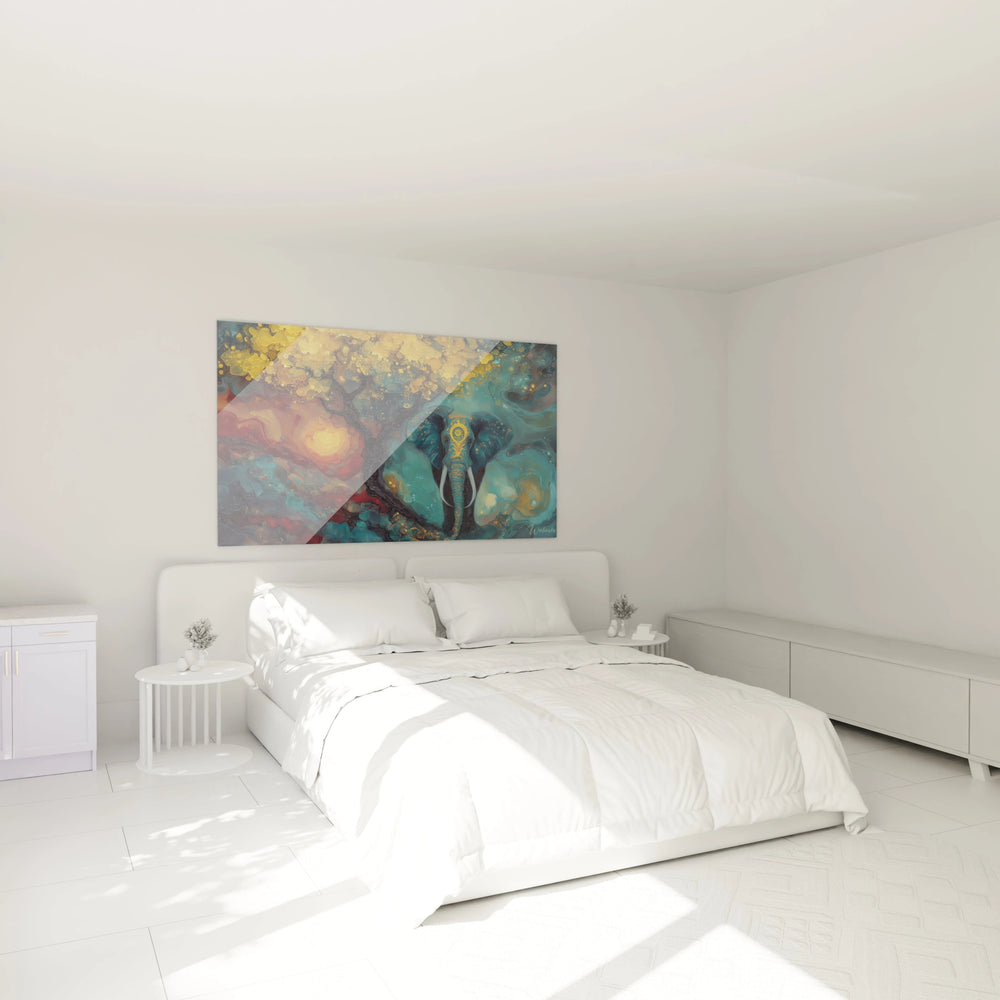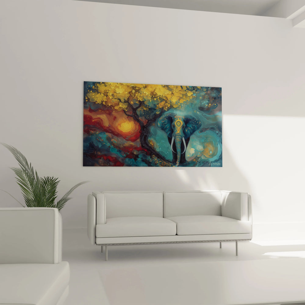 Cette œuvre d'art captivante présente un tableau éléphant aux ornements dorés sur un arrière-plan cosmique saisissant. L'animal majestueux se dresse au centre de la composition, paré de motifs géométriques dorés qui évoquent l'art traditionnel africain et indien. Le tableau éléphant orné se détache magnifiquement contre un paysage onirique où se mélangent des nuages turquoise et des formations rocheuses aux teintes chaudes. Cette décoration murale éléphant frappe immédiatement par son contraste saisissant entre la puissance de l'animal et la délicatesse des détails ornementaux qui parent sa silhouette imposante.