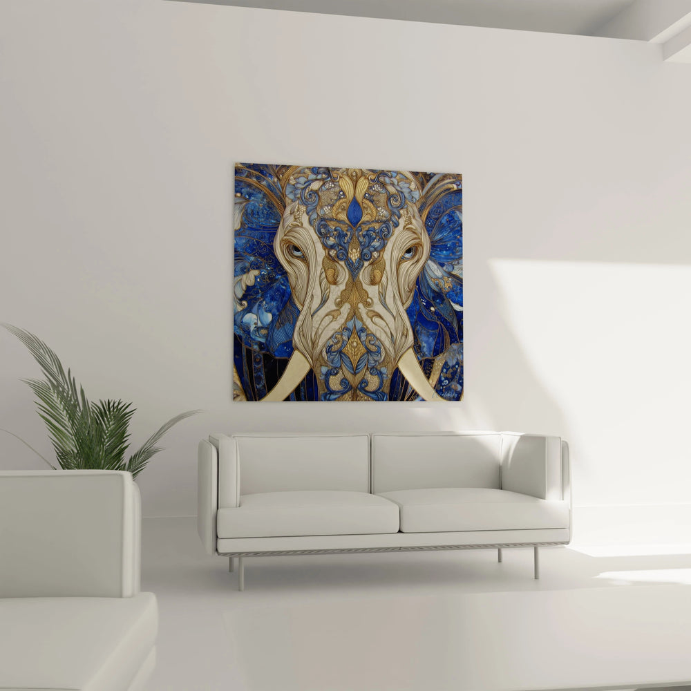La palette chromatique révèle une sophistication remarquable dans l'utilisation du bleu cobalt profond qui domine l'arrière-plan. Ce bleu intense contraste magnifiquement avec les tons dorés et ocre qui caractérisent l'animal principal. Les nuances beiges et crème apportent une douceur qui tempère l'intensité du contraste principal. Cette art mural éléphant bleu or démontre une maîtrise parfaite des harmonies complémentaires :