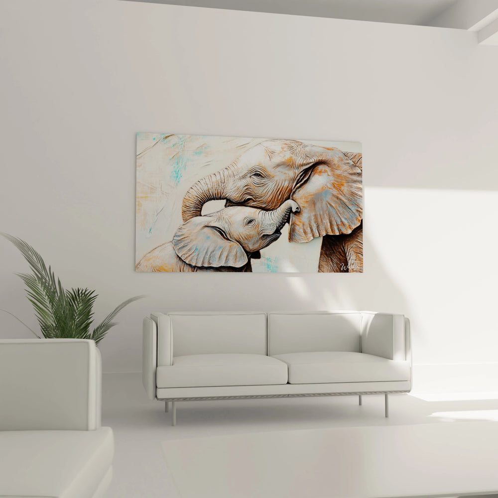 Plus qu’un simple élément décoratif, ce tableau raconte une histoire – celle d’un moment suspendu, où le regard d’une mère éléphant croise celui de son petit dans une expression pure de tendresse. C’est cette émotion authentique qui donne vie à votre espace et qui séduira tous ceux qui franchiront la porte de votre intérieur.