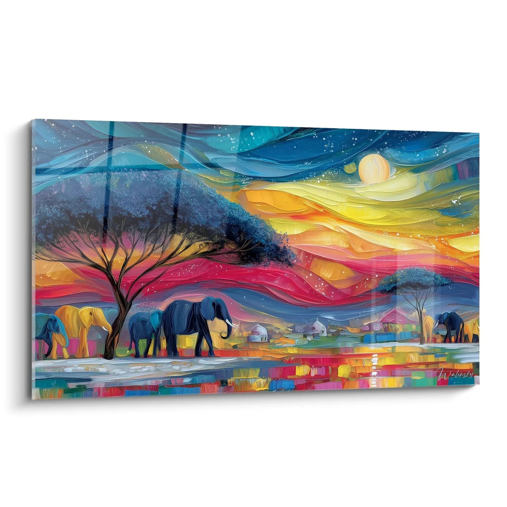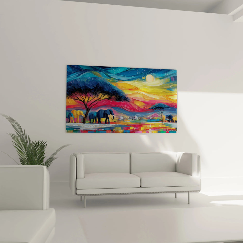 Ce tableau éléphants révèle une œuvre d'art exceptionnelle où dominent les teintes chatoyantes d'un coucher de soleil africain. La première impression saisit par son explosion de couleurs ondulantes qui traversent la composition, créant un spectacle visuel hypnotisant. Le tableau éléphants savane colorée présente un troupeau de pachydermes évoluant paisiblement au bord d'un point d'eau aux reflets multicolores. L'élément distinctif immédiat réside dans cette technique de superposition de couches chromatiques fluides qui transforment un paysage traditionnel en vision onirique. L'artiste a su capturer l'essence même de la majesté africaine à travers ces géants gris se détachant sur un arrière-plan flamboyant.