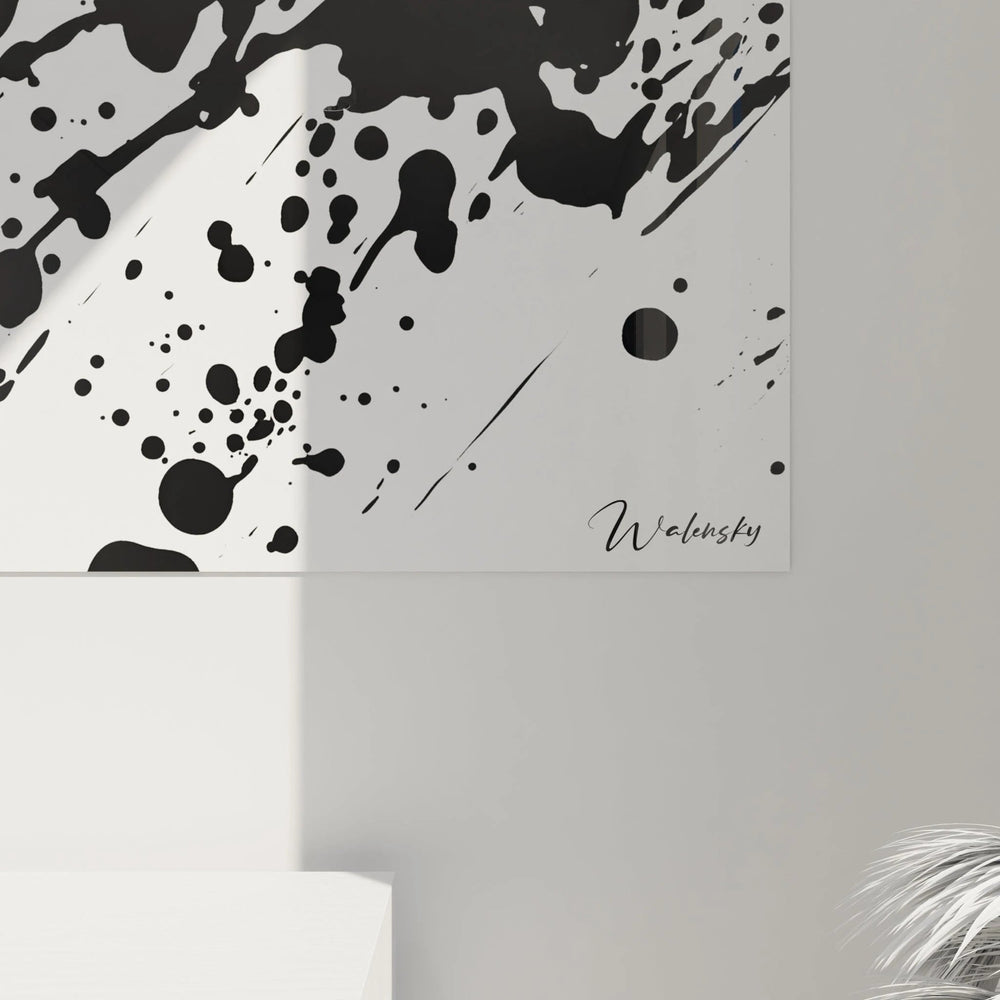 Ce tableau éclaboussures présente une composition abstraite saisissante où l'encre noire explose littéralement sur une surface immaculée. Cette décoration murale abstraite noire capture l'essence du mouvement spontané à travers des projections dynamiques qui semblent figées dans le temps. Le tableau éclaboussures encre noire révèle une énergie brute qui transforme instantanément l'espace. Les taches varient de simples points délicats à d'imposantes coulées organiques, créant un rythme visuel captivant. Cette œuvre abstraite gestuelle évoque la libération créative et l'expression pure de l'émotion artistique contemporaine.