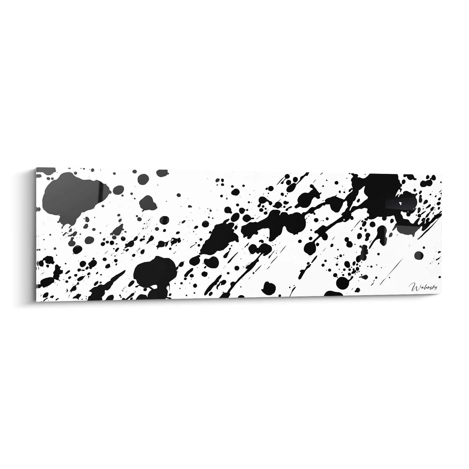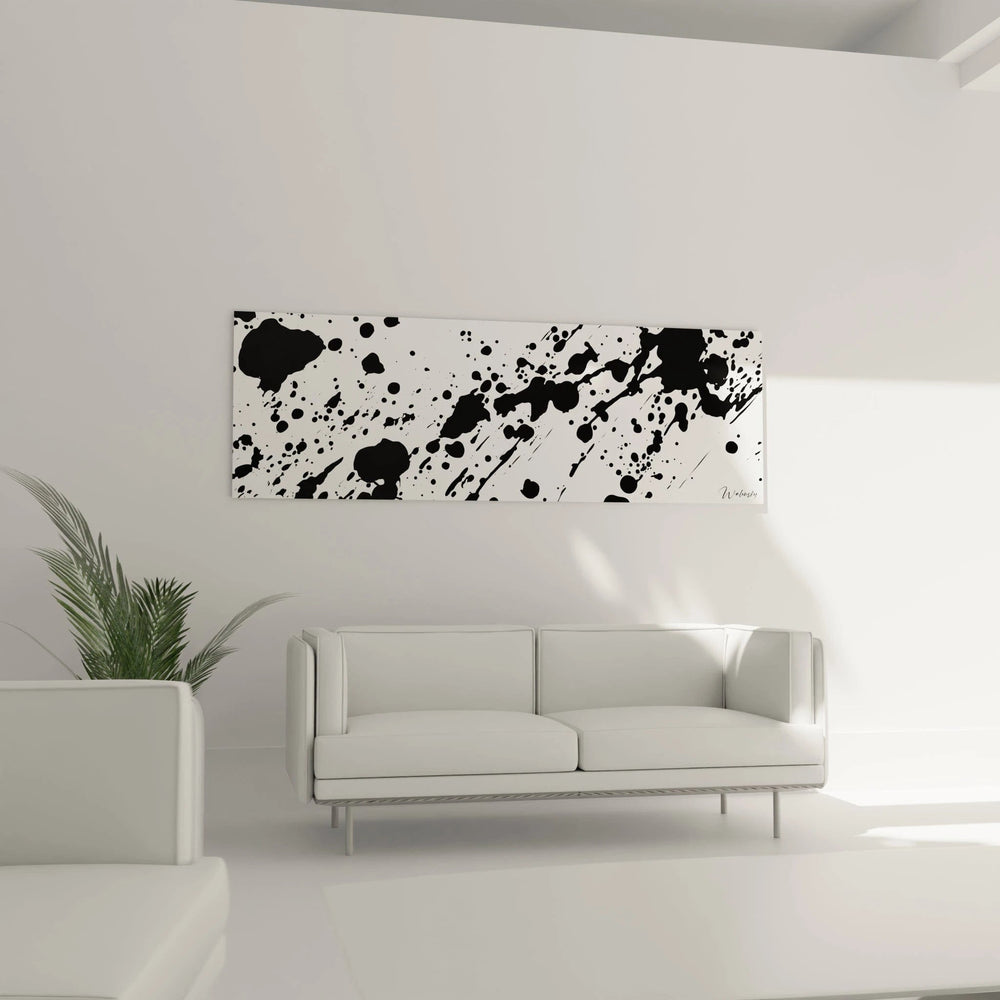 Ce tableau éclaboussures monochrome contraste exploite exclusivement la puissance du noir profond sur blanc immaculé. Cette décoration murale minimaliste noir tire sa force expressive de ce choix radical bicolore. Les nuances de noir varient subtilement :