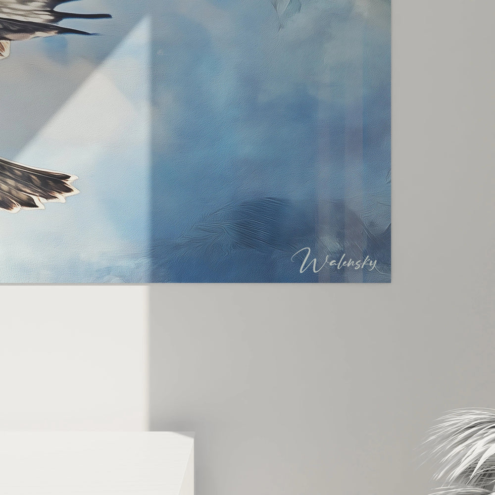Chaque détail de ce tableau a été pensé pour éveiller vos émotions et métamorphoser votre intérieur en un sanctuaire raffiné. Les dégradés d'azur et de bleu profond transmettent la puissance sereine d’un aigle en vol, symbole de liberté et d’ambition, tandis que le jeu d’ombres et de lumière donne vie à un horizon qui semble s’étirer à l’infini, évoquant à la fois mystère et sérénité.