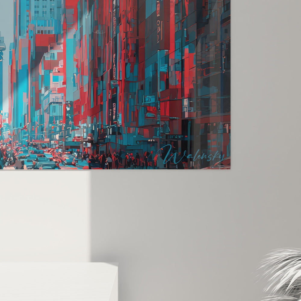 La palette chromatique de ce tableau mural New York joue sur un contraste saisissant entre les tons rouge corail et les nuances de bleu turquoise. Ces couleurs complémentaires créent une dynamique visuelle intense, symbolisant l'énergie perpétuelle de la métropole. Le rouge évoque la passion et l'ambition new-yorkaise, tandis que le bleu apporte une dimension de sérénité et de modernité à cette œuvre d'art urbaine.