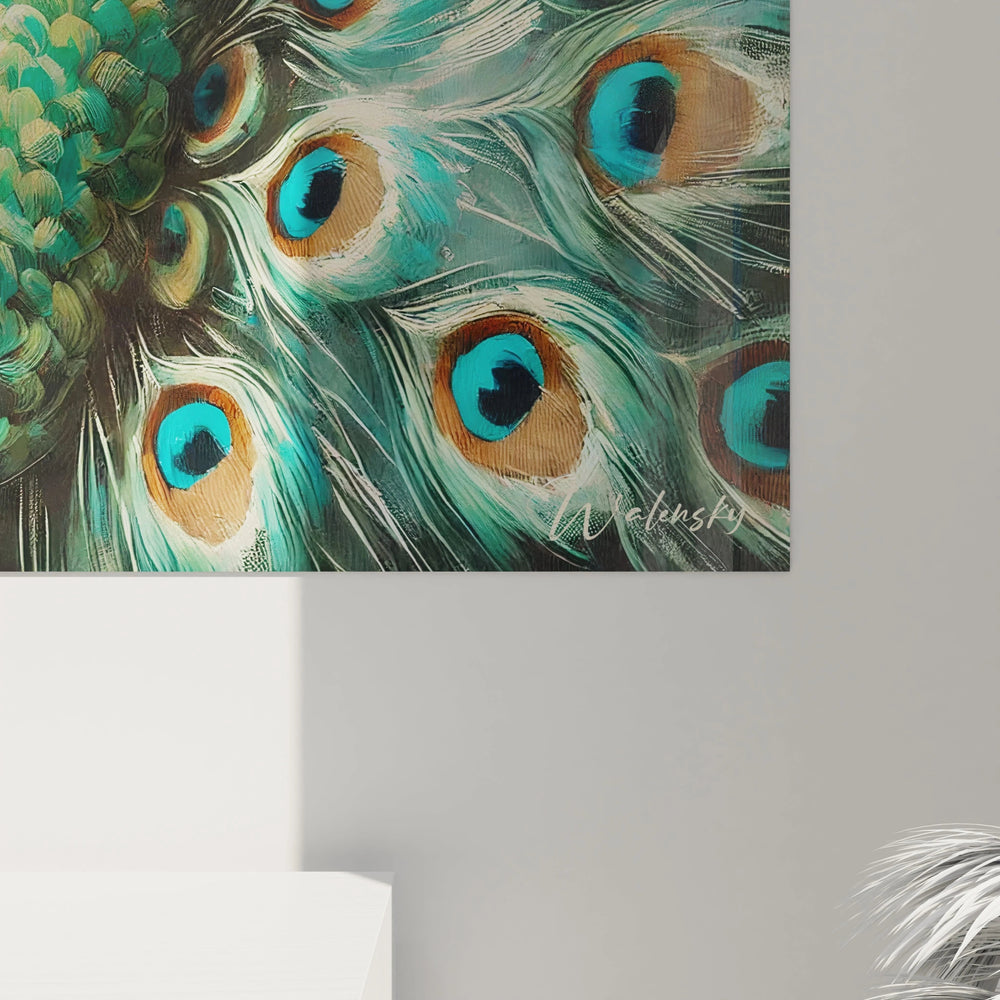 Ce subtil mélange chromatique ne se contente pas d’habiller vos murs : il insufflera une aura de mystère et de prestige, matérialisant la fierté et la force que symbolise le paon. En posant le regard sur ce tableau, vous ressentirez une invitation à la rêverie, à la fois lumineuse et élégante.