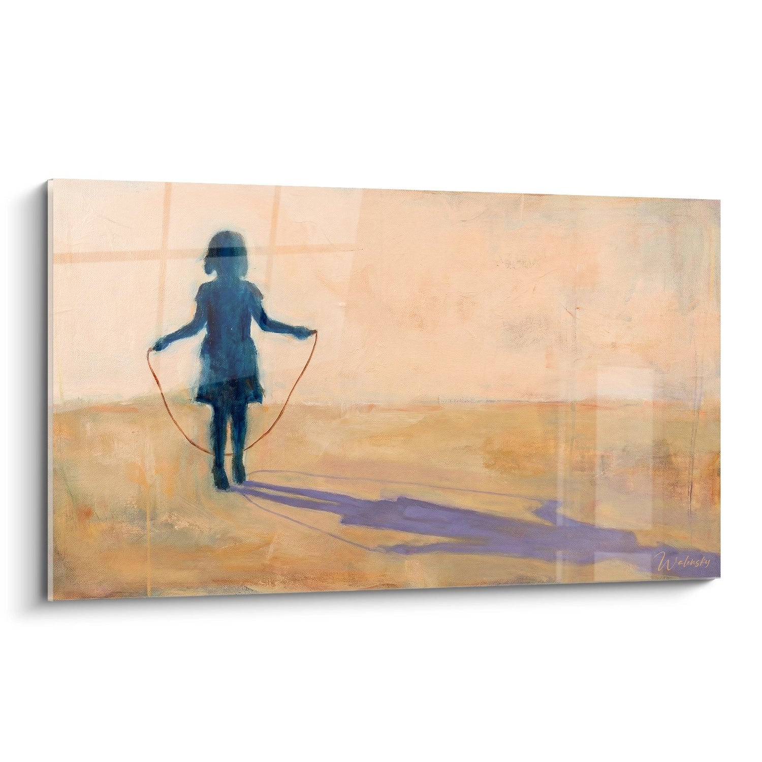 Cette œuvre artistique capture avec une sensibilité remarquable l'instant magique d'un enfant en plein jeu de corde à sauter. La silhouette bleue de l'enfant se détache magnifiquement sur un fond aux tonalités chaudes, créant un contraste saisissant qui attire immédiatement le regard. L'artiste a su immortaliser ce moment de pure joie enfantine avec une technique picturale moderne qui mélange réalisme et impressionnisme. La composition équilibrée place l'enfant au centre de l'œuvre, tandis que son ombre projetée au sol ajoute une dimension supplémentaire à la scène. Cette peinture murale moderne transformera instantanément votre espace de vie en galerie d'art contemporain, apportant une touche de dynamisme et de nostalgie à votre décoration intérieure. L'œuvre évoque l'insouciance de l'enfance et la beauté des plaisirs simples, faisant de ce tableau un choix parfait pour une chambre d'enfant, un salon familial ou tout espace nécessitant une note d'optimisme et de mouvement.