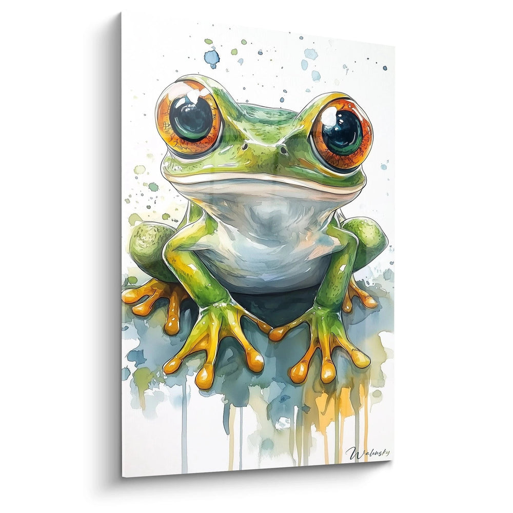 Au cœur de cette création, une grenouille aux yeux immenses se déploie dans un mélange subtil de dynamisme et de douceur. Les éclaboussures colorées évoquent la spontanéité d’un trait d’enfant, tandis que les nuances vives de vert et d’orange insufflent une énergie joyeuse et rafraîchissante. Ce tableau ne se contente pas d’habiller les murs : il crée une ambiance où la découverte et la rêverie se mêlent harmonieusement.