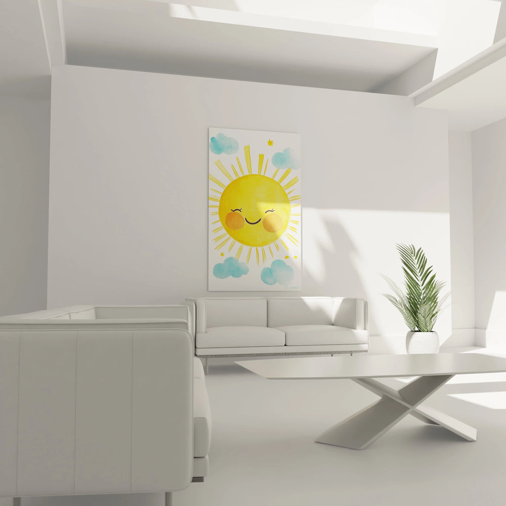 Chaque détail de cette œuvre a été pensé pour réveiller les émotions les plus tendres. Le jaune lumineux du soleil, rehaussé de joues rosées bienveillantes, distille une sensation immédiate de bonheur. Les nuages tout en douceur, aux nuances pastel, flottent en légèreté, comme un doux murmure invitant au rêve et à l’imagination. Ce tableau est une véritable étreinte visuelle qui transforme subtilement l’espace en un sanctuaire chaleureux où votre enfant pourra s’épanouir.