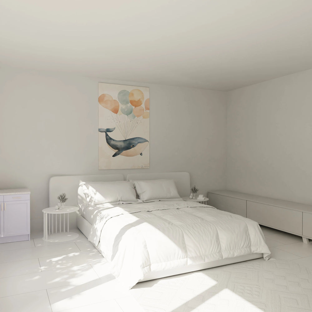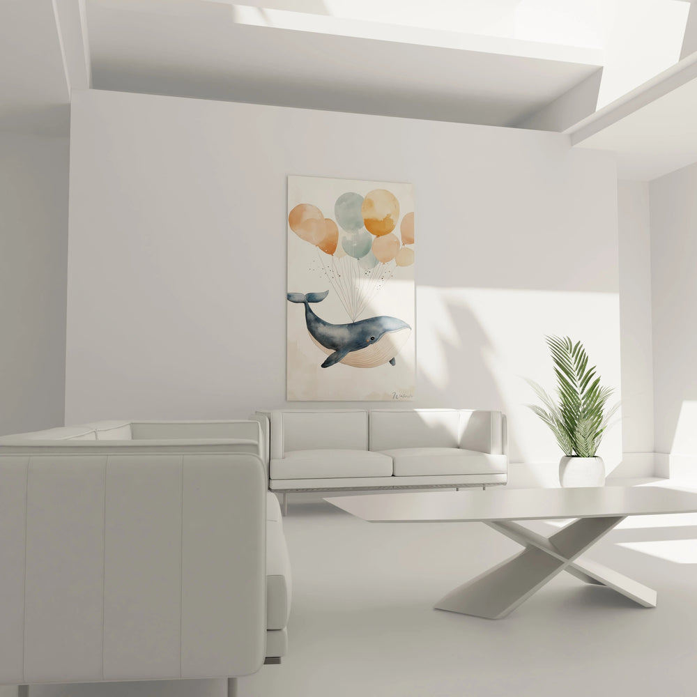 Imaginez une majestueuse baleine portée avec grâce par des ballons colorés, suspendue dans un ciel infini de calme et de tendresse. Cette scène poétique symbolise la liberté absolue, celle de croire que tout est possible. Chaque regard posé sur cette composition inspire une douce rêverie, un voyage où l’enfant découvre que son imagination n’a pas de limites.