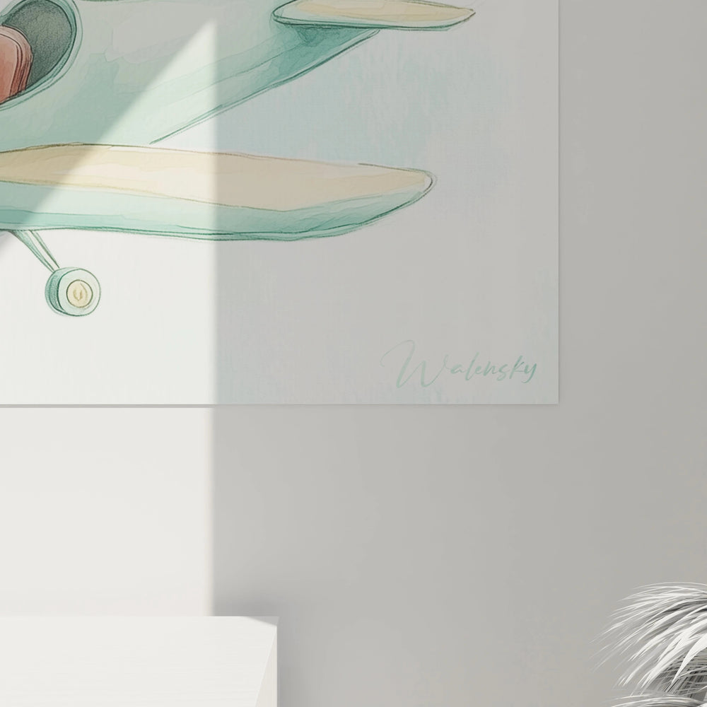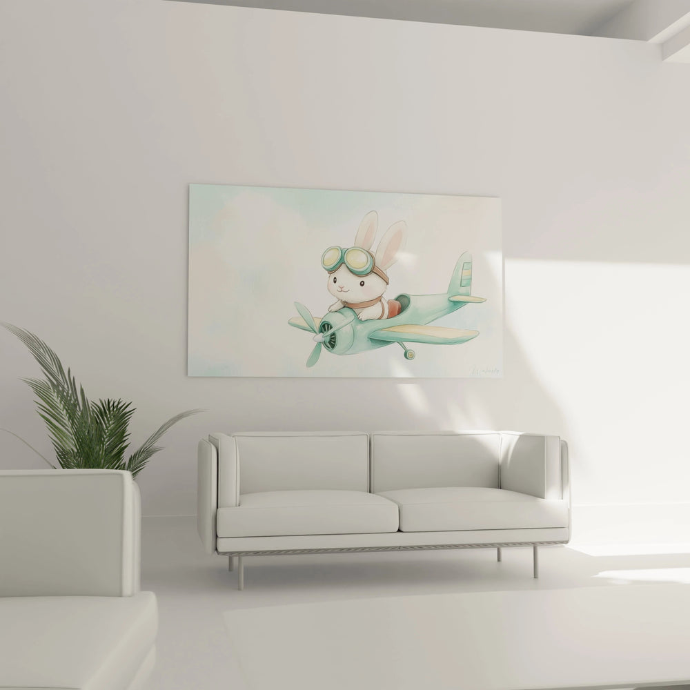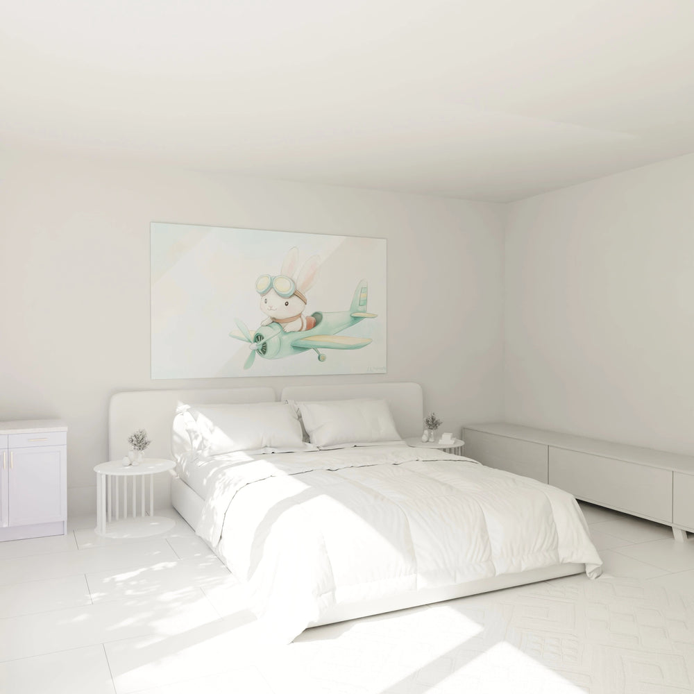 Chaque coup de pinceau capture la sensation unique du rêve éveillé. Le lapin, avec ses grandes oreilles dressées et sa tenue d’aviateur, incarne la curiosité insatiable qui pousse les petits explorateurs à découvrir le monde. Cette œuvre invite à un voyage empreint de poésie et de sérénité, transformant la chambre en un cocon où s’entrelacent tendresse et audace.