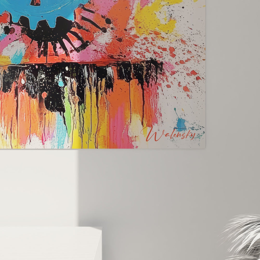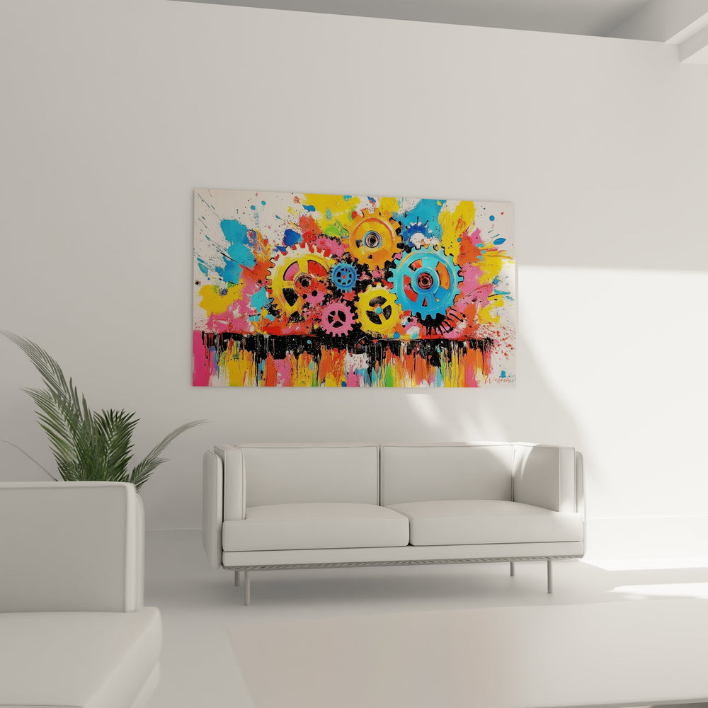 Ce tableau mural engrenages colorés offre une vision artistique saisissante de l'univers industriel. L'œuvre présente un assemblage dynamique de roues dentées multicolores sur un fond éclaboussé de peinture, créant un contraste frappant entre la précision mécanique et l'expression artistique libre. Les engrenages industriels décoratifs se déclinent en teintes vives : orange éclatant, bleu azur, rose fuchsia, jaune solaire et rouge vermillon. Cette décoration murale industrielle moderne capture l'essence du mouvement perpétuel des machines à travers des éclaboussures de couleurs qui semblent jaillir de chaque rouage. Le tableau art mécanique contemporain mélange habilement l'esthétique du street art avec l'imagerie industrielle, créant une œuvre unique où la technique rencontre l'émotion. Les coulures de peinture noire en partie basse de l'œuvre évoquent l'huile de moteur, renforçant le lien avec l'univers mécanique. Cette toile engrenages style graffiti transforme les éléments techniques en véritable symphonie visuelle, parfaite pour une décoration industrielle colorée.