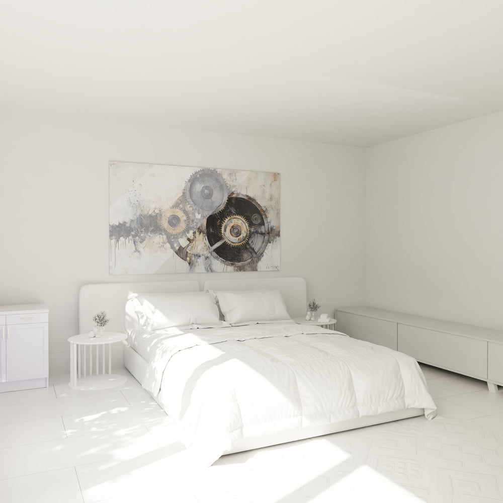La palette chromatique de ce tableau mural décoratif industriel s'articule autour de tons métalliques subtils : gris anthracite, beiges nacrés et touches d'ocre doré. Ces couleurs industrielles modernes évoquent la patine du temps sur les machines, créant une atmosphère nostalgique et authentique. La symbolique des engrenages artistiques renvoie à la précision, au mouvement perpétuel et à l'ingéniosité humaine, transformant la mécanique en poésie visuelle.