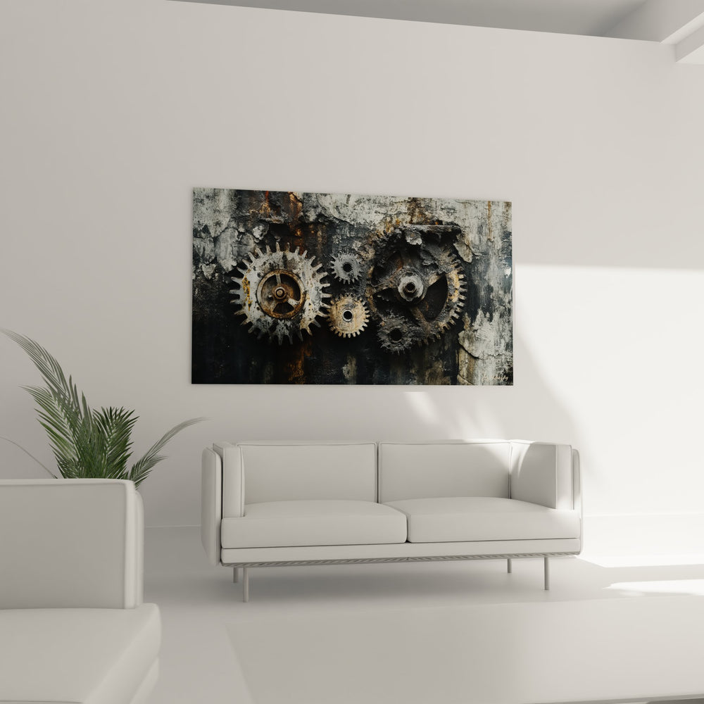 Tags : engrenages industriels, mécanismes vintage, art mécanique, décoration industrielle, rouages anciens