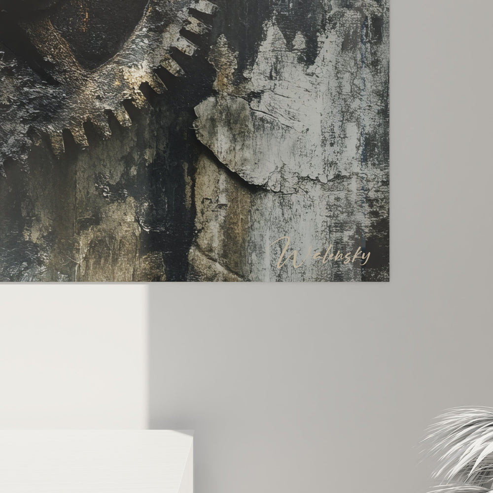 La palette chromatique de ce tableau décoratif engrenages puise dans les tons métalliques authentiques : gris acier, cuivre oxydé et rouille dorée. Ces couleurs évoquent le passage du temps et l'usure noble des machines industrielles anciennes. La symbolique des engrenages représente la précision, l'interconnexion et la continuité du mouvement, métaphores de la vie moderne et de ses rouages complexes.