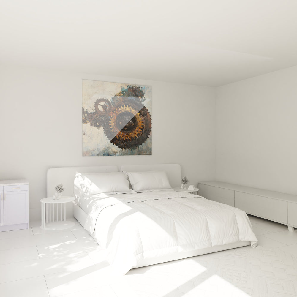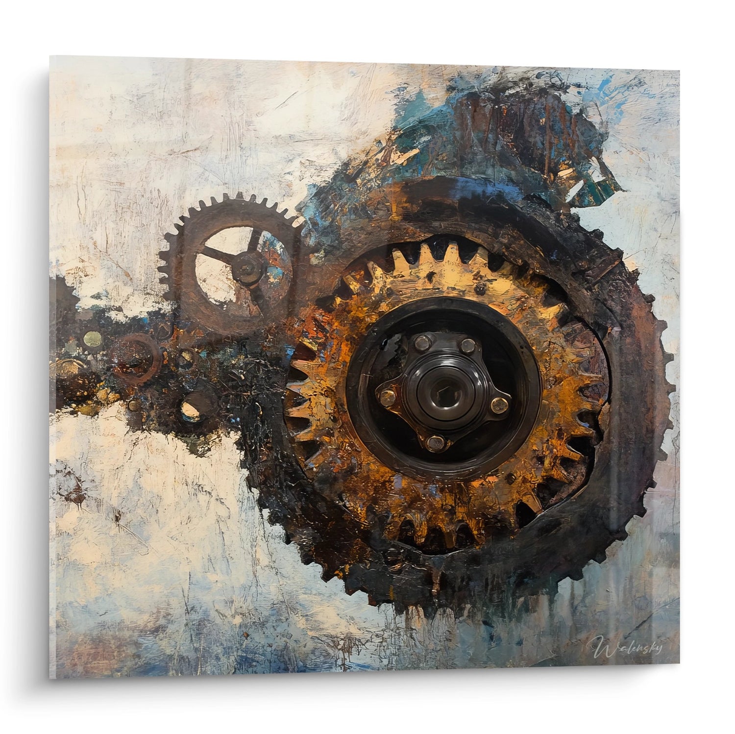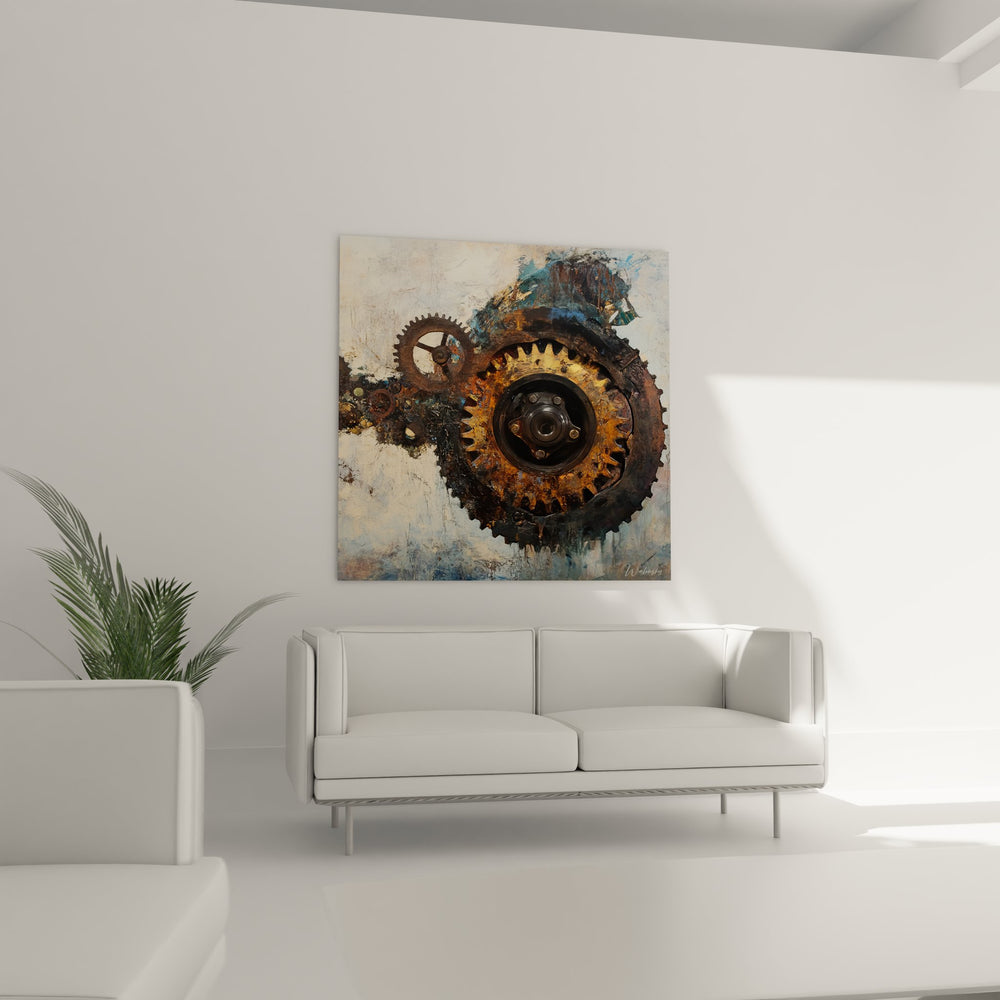 La symbolique des engrenages dans cette œuvre évoque le temps qui passe, l'ingéniosité humaine et la beauté de la mécanique industrielle. La palette chromatique dominée par les ocres rouillés, les bleus délavés et les tons métalliques crée une atmosphère nostalgique. Ces couleurs industrielles vintage renforcent l'aspect authentique et intemporel de la composition, symbolisant la transformation et l'évolution technologique.